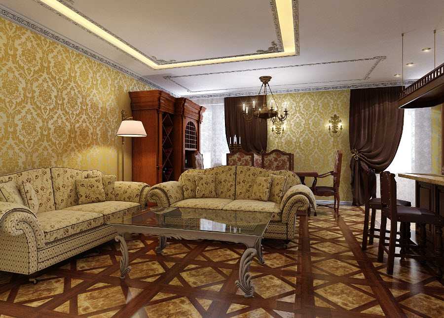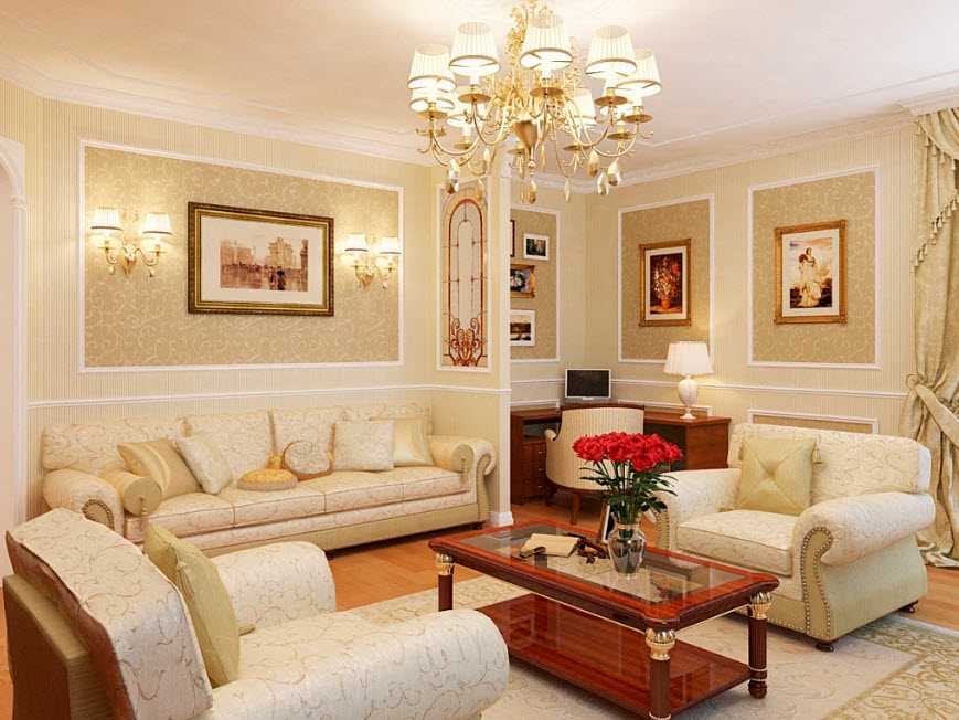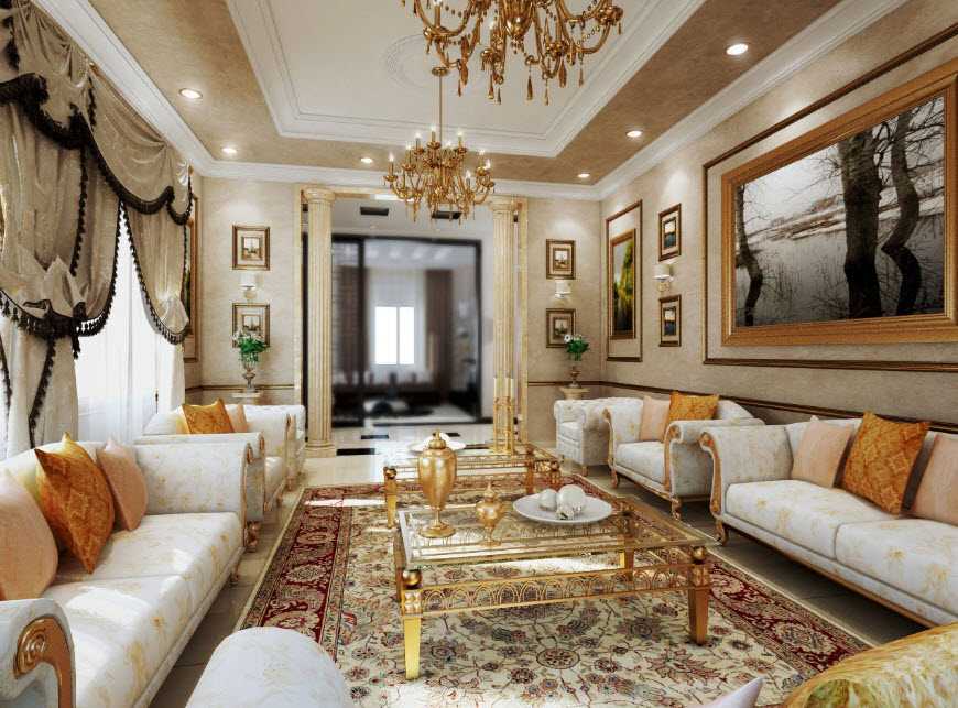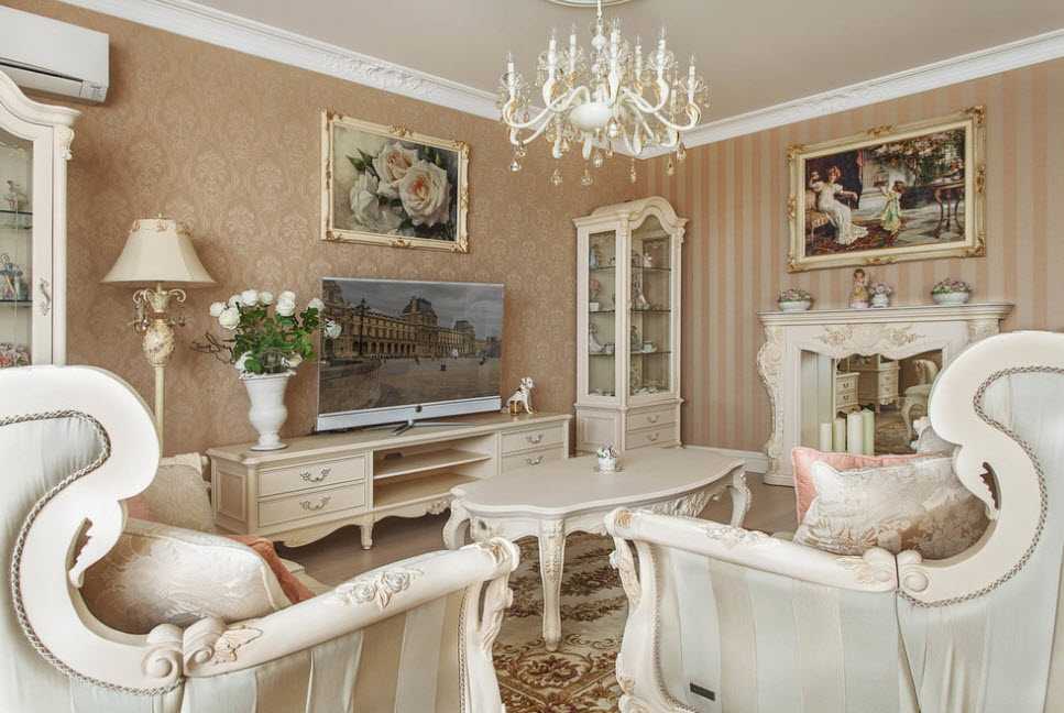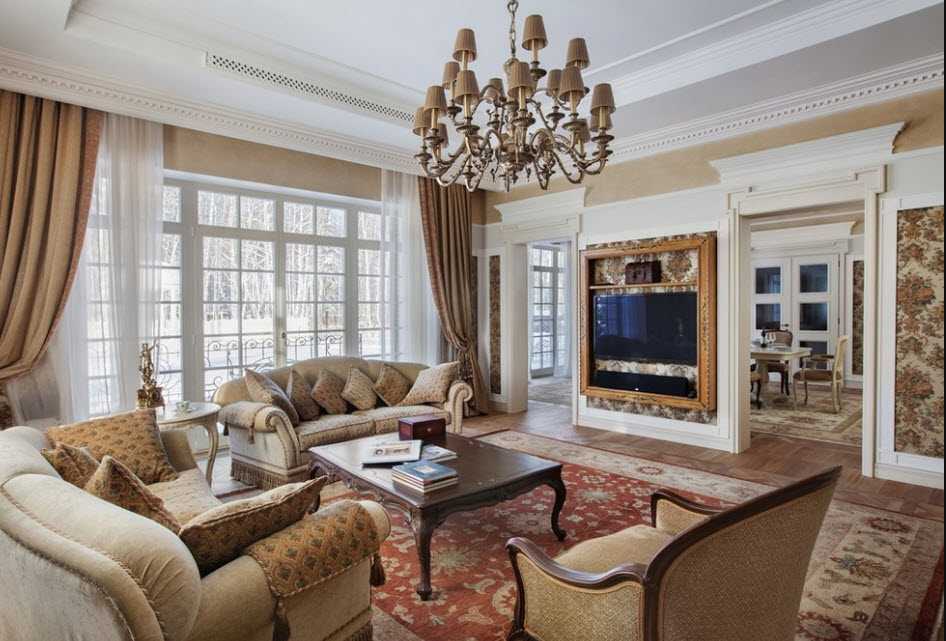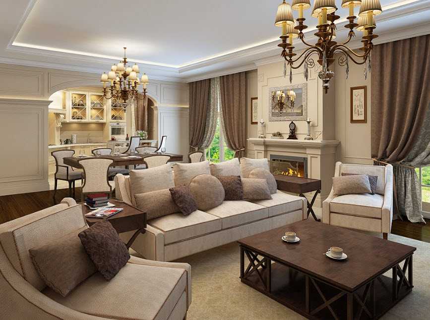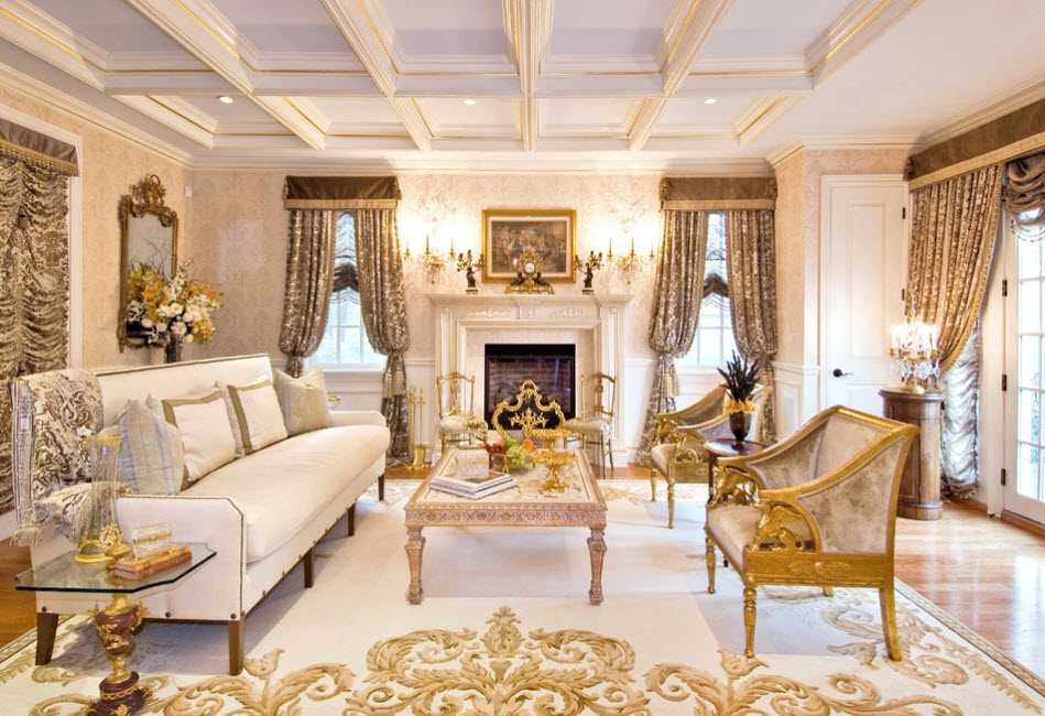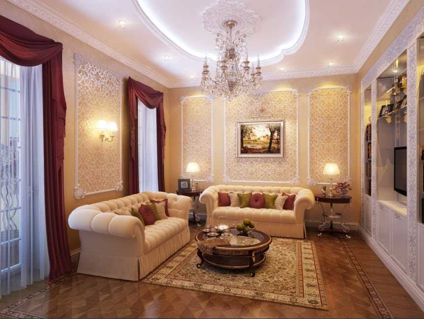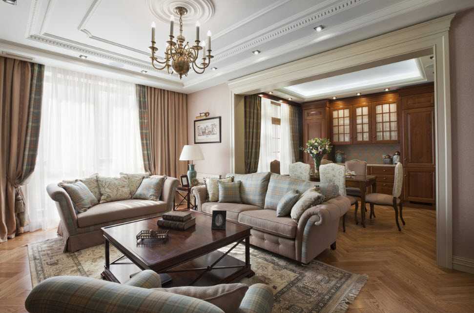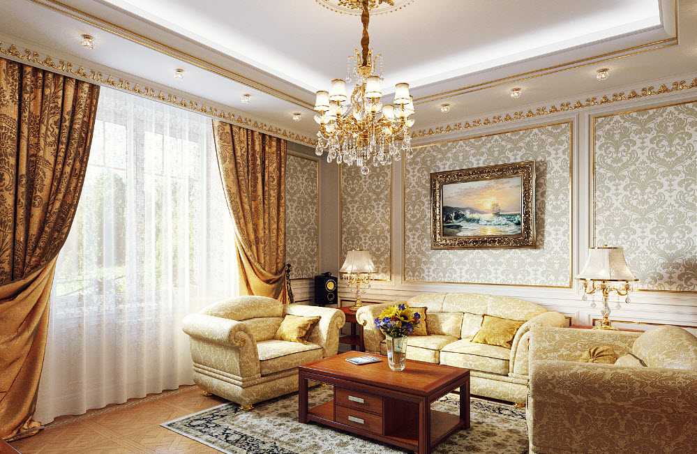 Мебель классика чаще всего устанавливается в гостиных, так как эта комната предназначается для приема гостей и должна олицетворять красоту и уют. Желательно не покупать отдельные элементы, а приобрести ансамбль, который будет объединен одним цветом, узором и текстурой. Массивное трюмо, изящный столик с витыми ножками, кресла и большой диван, стенка во всю стену.