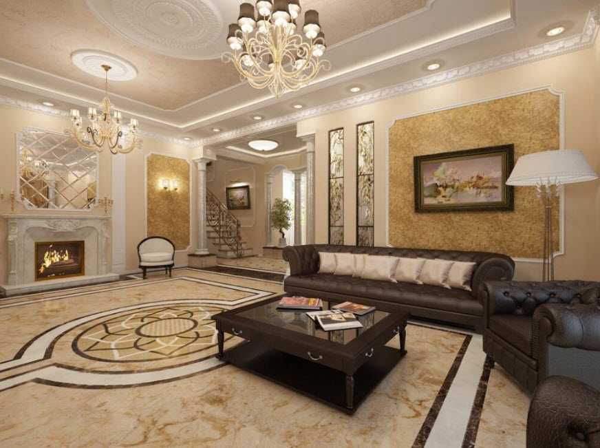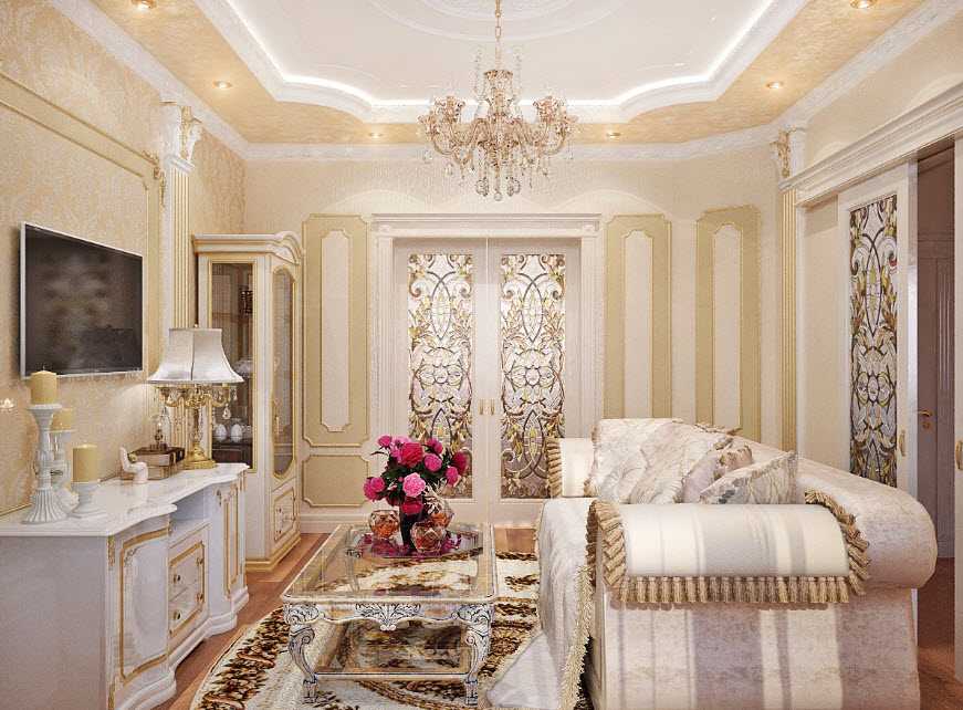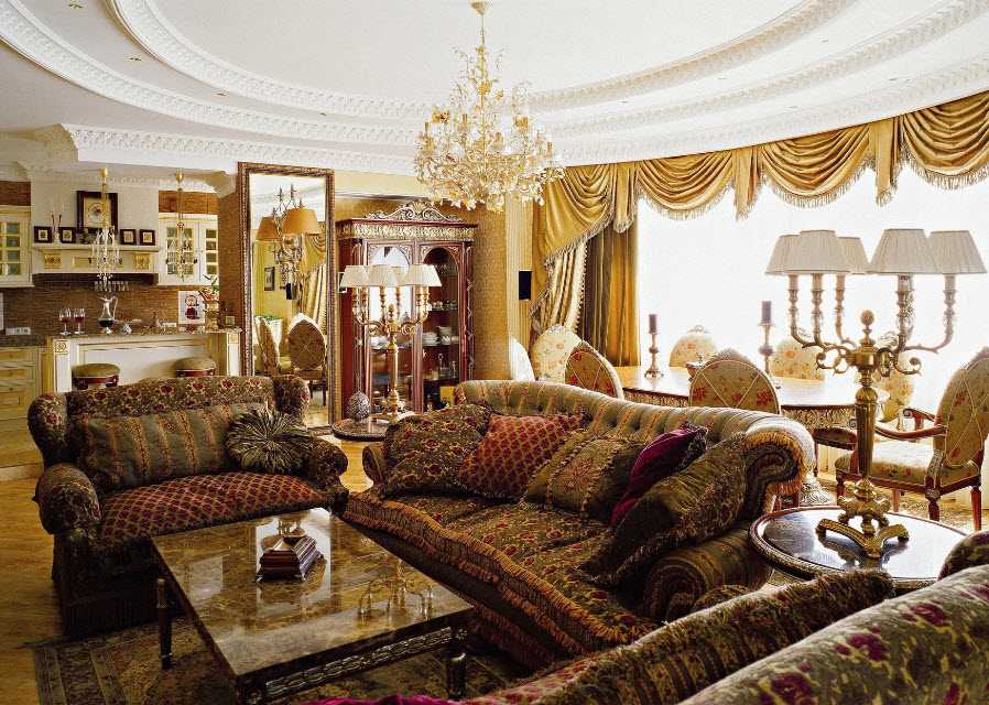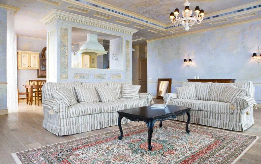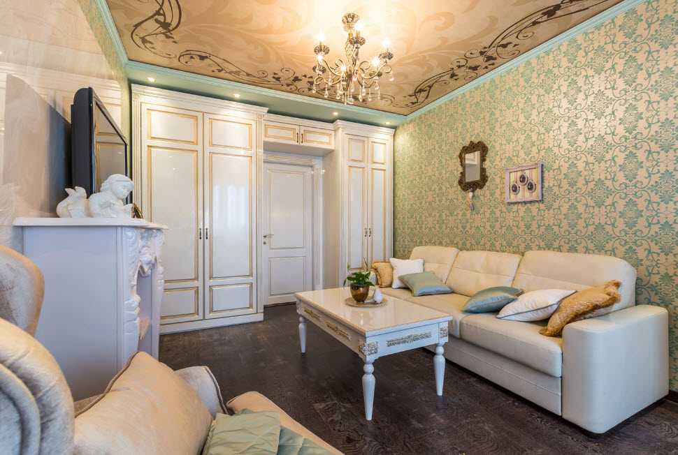 Сделать стены визуально выше, а сам дизайн более уравновешенным, поможет оштукатуренный потолок. В некоторых случаях в классическом интерьере допустим натяжной потолок, если необходимо:
