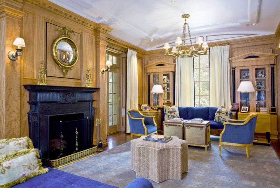 - Мебель в строгом английском стиле, украшенная бронзовыми вензелями, изящными бра и затейливыми орнаментом;