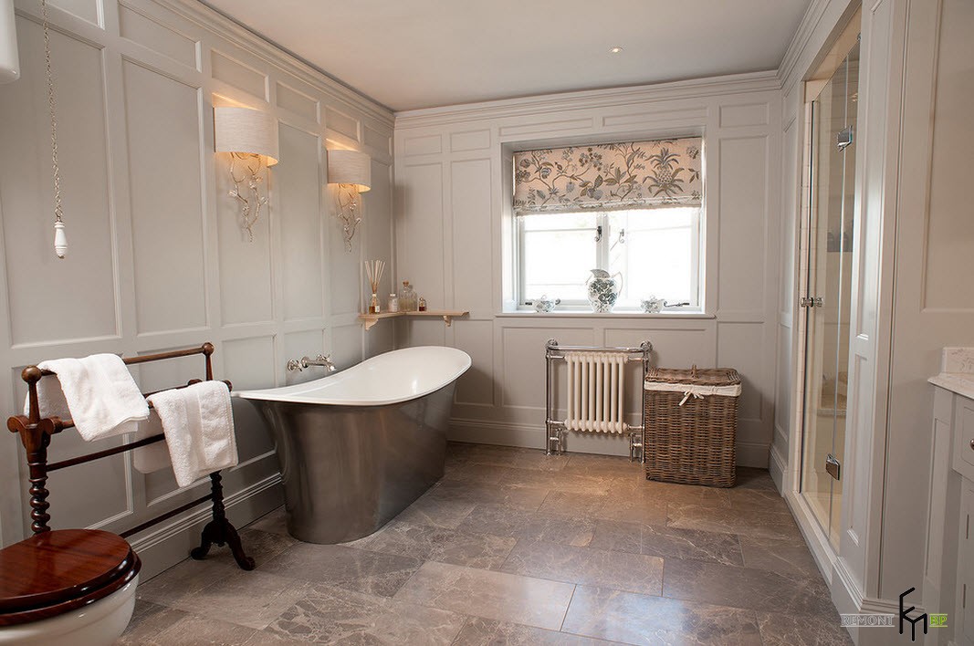 Центральное место в комнате займёт сама ванная, расположенная на специальном возвышении или гнутых ножках ручной работы.