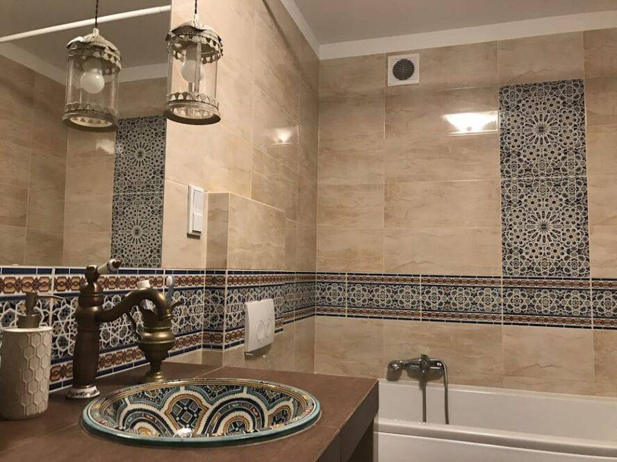 Калейдоскоп узоров, найденных на марокканских плитках, означает, что лучше всего использовать их на небольшой поверхности ванной комнаты. Использование плитки на всех стенах может вызвать эффект «коробки», заполненной арабскими узорами, особенно в небольших ванных комнатах без окон.