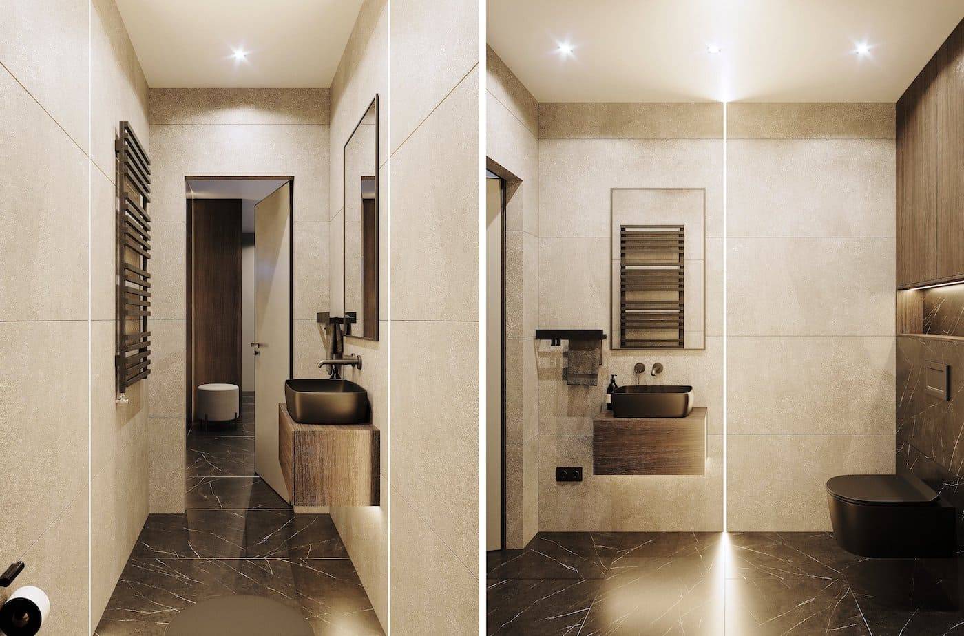 К примеру, стены отделываются тёмно-бежевой плиткой, а тумбы и шкафчики подбираются более насыщенных цветов, имитирующих дерево. Хорошо подходят для такого дизайна длинные тумбы со встраиваемой раковиной.