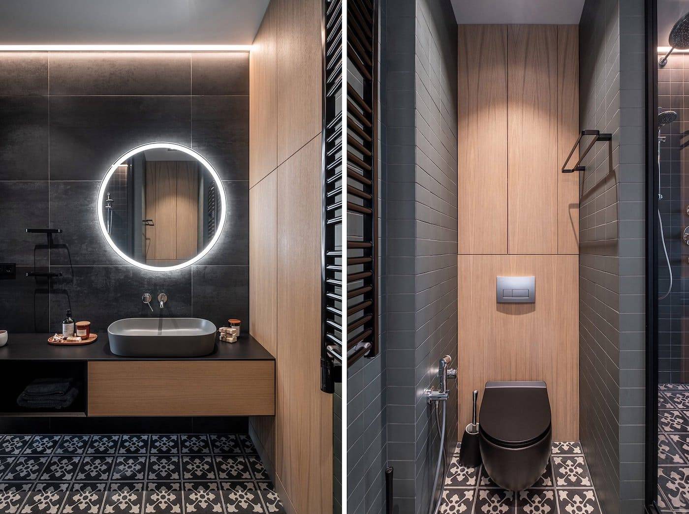 Апофеоз всего 2-ого раздела — серый цвет и дерево. Этих 2-ух компонентов уже достаточно для красивого дизайна ванной. И дело не в цвете, а в фактуре. Прожилки, сучки и запилы на качественном керамограните под дерево. Шероховатость и неровность бесконечного числа видов серой плитки под бетон и камень.