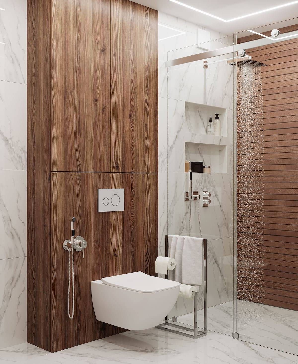 - Светлые цвета и плитка под светлое дерево — ванная в скандинавском стиле.