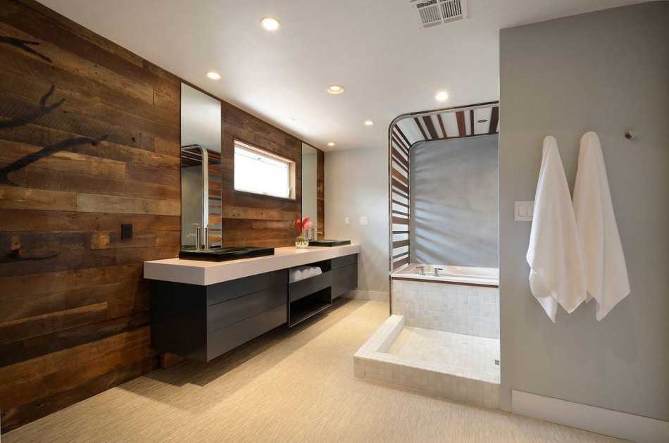 Если пол и потолок сделаны из досок, то их гармонично дополняет стеклянная душевая кабина, которая вносит легкость в интерьер. Материалы, из которых выполнена мебель, желательно выбирать натуральные. Это может быть гипс, мрамор, гранит. Акриловая ванная в стиле модерн также прекрасно впишется и подчеркнет изысканность данного интерьера.