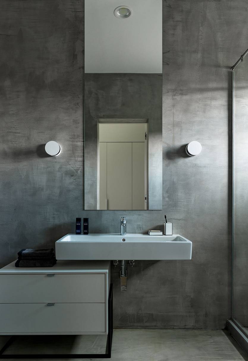 - Более тёмные цвета и имитация бетона — лофт ванная.