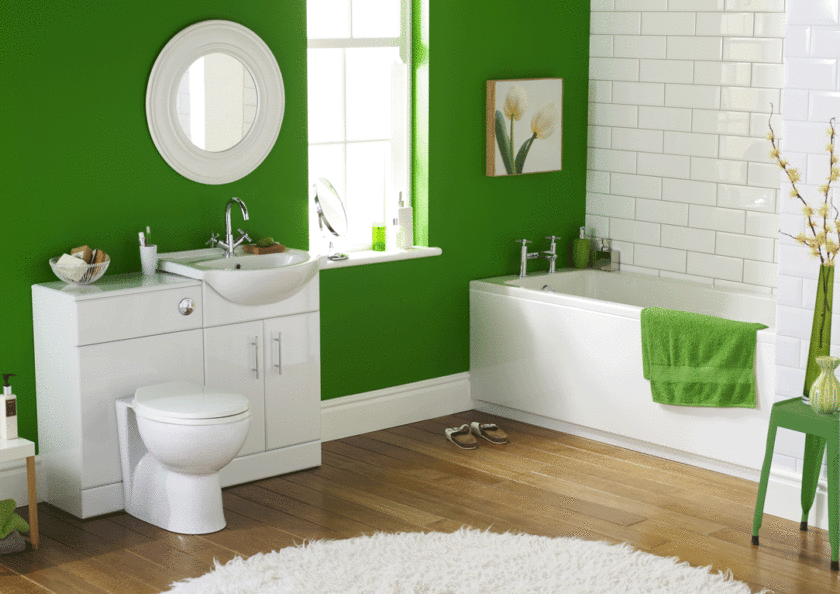 В гамму входят варианты от нежного лайма до темной травы, подходят для эко-стиля, классики и минимализма. Оттенок в помещении комбинируют со светлой палитрой (молочный, бежевый). На полу роскошно смотрится сочетание с цветом-компаньоном (узор на кафеле или коврик). Акценты расставляют при помощи яркого оранжевого, насыщенной фуксии или сочного желтого. Сантехнику и стиралку оставляют в классическом белом.