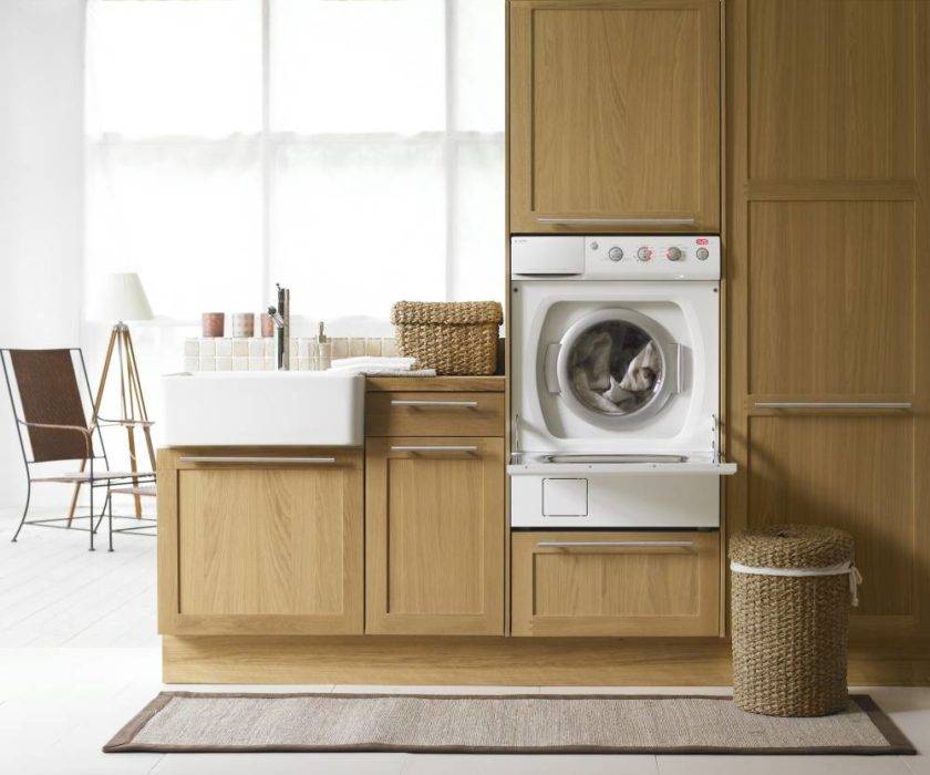 Оптимальный вариант для установки стиральной машины. Но стоит учитывать, что чрезмерная влажность, частое попадание воды на корпус стиралки могут вывести ее из строя. Шкаф с машиной лучше делать закрытым или располагать подальше от раковины или душевой кабины.