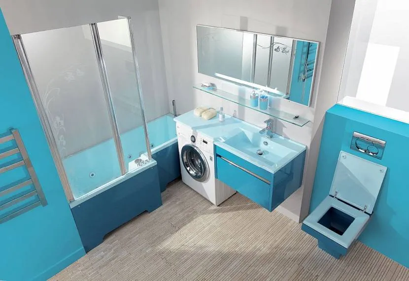 Холодный цвет дизайнеры рекомендуют использовать в дуэте с белым в классике и минимализме. Резкие переходы от одного тона к другому привносят в пространство ощущение свежести. Корпус стиральной машины не стоит прятать под панелями, а обыграть контраст с голубыми стенами. В ванной комнате нужно хорошее освещение, иначе интерьер выглядит мрачным.
