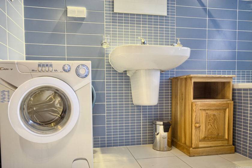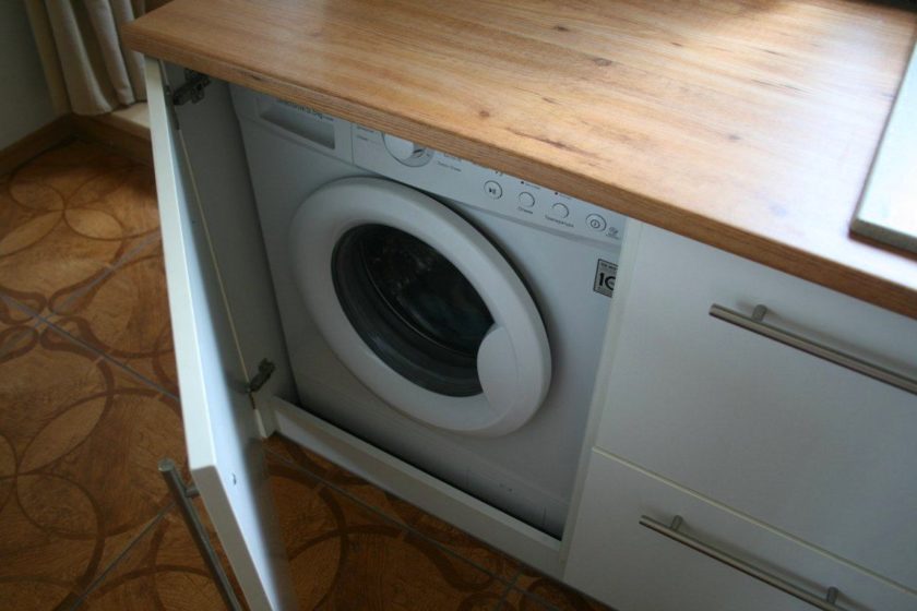Машинка не должна мешать свободному передвижению по комнате, лучше отвести ей угловое место. Также можно поместить технику под раковину «кувшинку» или накрыть сверху частью столешницы.