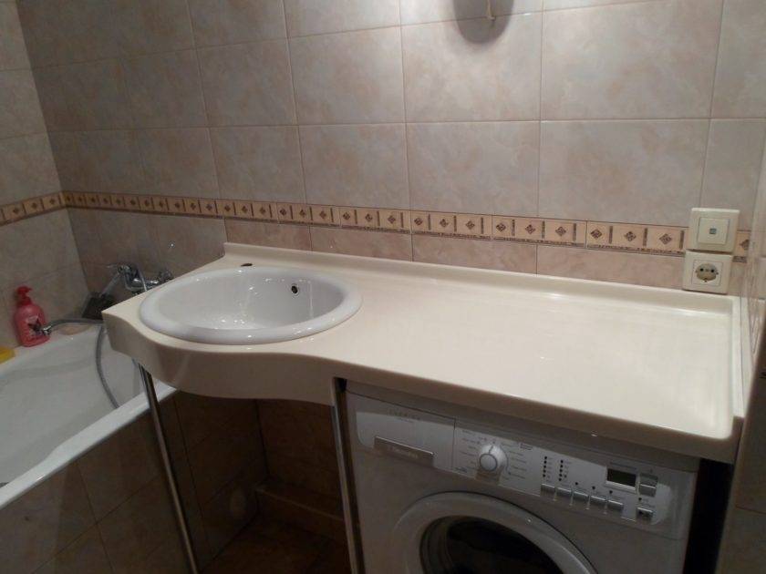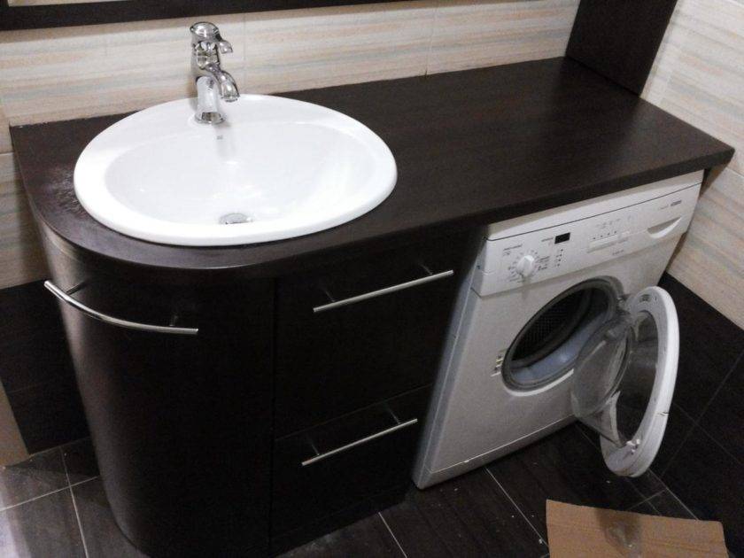 Установка техники рядом с умывальником обычно приводит к скоплению мусора между ними. Избежать подобных проблем и провести компактное размещение техники поможет ее монтаж под столешницей, над которой будет располагаться умывальник. Подобный способ установки обладает следующими преимуществами: