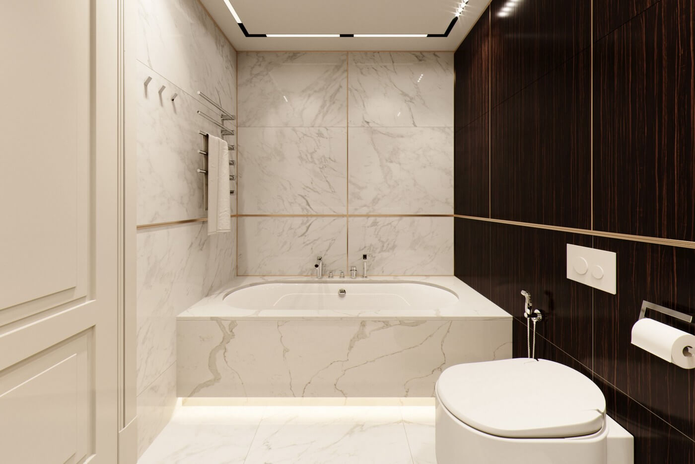 Совсем не обязательно обрабатывать все стены под мрамор — можно использовать, как в этой квартире, сочетание керамогранитных плит под мрамор и дерево. Проект квартиры «Кременчугская», дизайнер Евгений Жданов