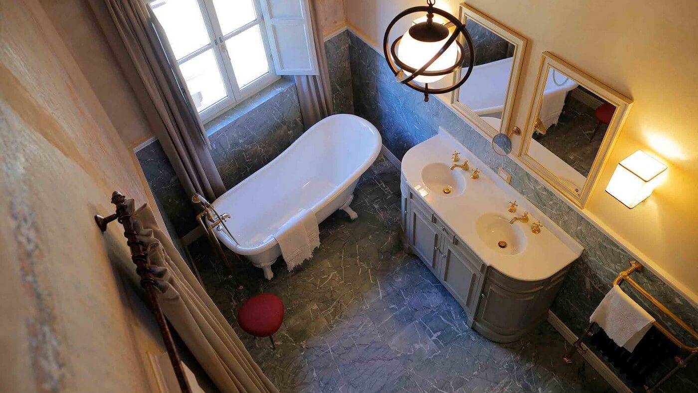 Серый мрамор на полу в этой классической и типичной итальянской ванной комнате придаёт интерьеру на фото основательность