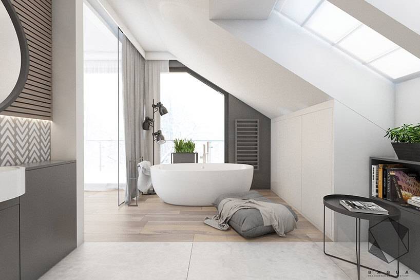 Влажная зона заметно отделена остеклением чердак и плиткой под дерево, что делает ванную комнату очень уютной. На полу дизайнеры использовали плитку, имитирующую бетон, подчеркнув индустриальный характер помещения.
