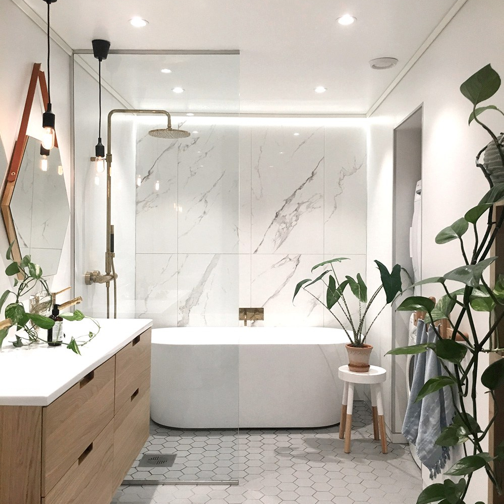 Обычно глянцевая плитка — плохой выбор. Но в интерьере маленькой ванной — глянец ок. Лучшая как обычно полуматовая. Если поверхность не плоская, а с текстурой — хорошо.