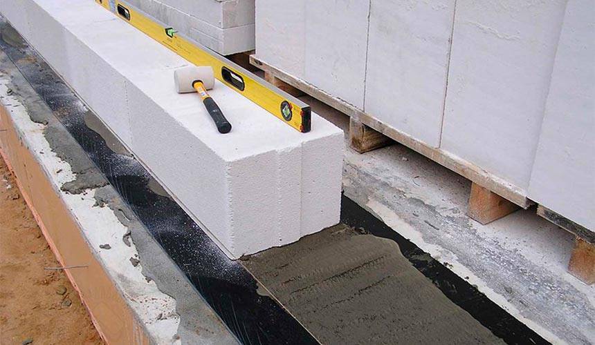 - Укладка первого ряда газосиликатных блоков – важный этап строительства. Именно от ее качества будет зависеть в будущем внешний вид здания и время его службы. После постановки очередного блока требуется проверка уровнем горизонтали и вертикали. При выявлении неровностей их следует поправить при помощи деревянной или резиновой киянки.