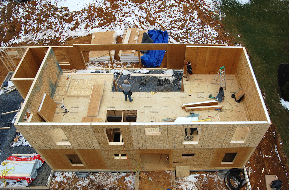 Строительство жилых домов из плит ОСБ делается по утвержденному проекту. На заводе изготавливают блоки, маркируют их. На месте делается легкий фундамент и затем на него монтируют каркас дома и обшивают полученными деталями. Утеплитель укладывается при производстве блоков. Такой способ строительства имеет ряд преимуществ, перед стандартными кирпичными зданиями.