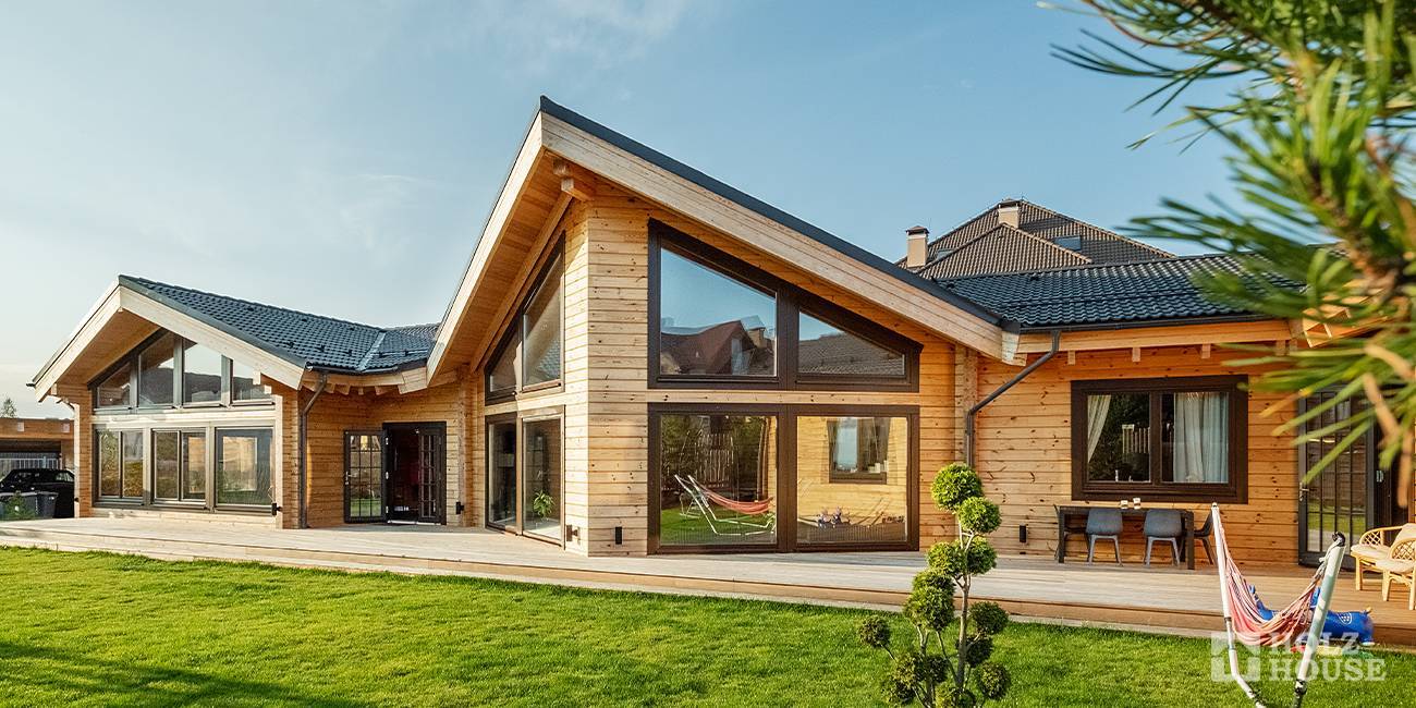 В доме из бруса с панорамными окнами много света, он смотрится презентабельно. Когда вы находитесь внутри, то перед вами открывается прекрасный вид на приусадебный участок.