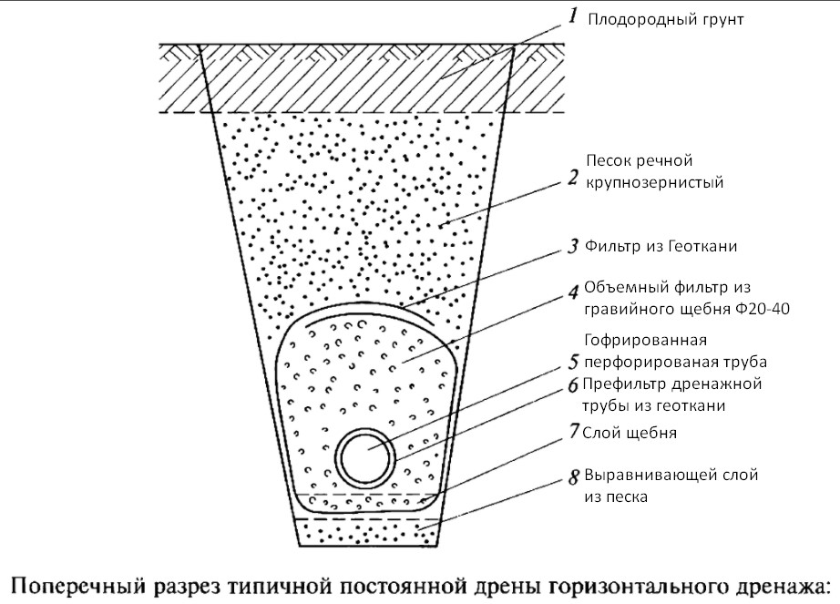 Поперечный разрез дренажной горизонтальной дрены