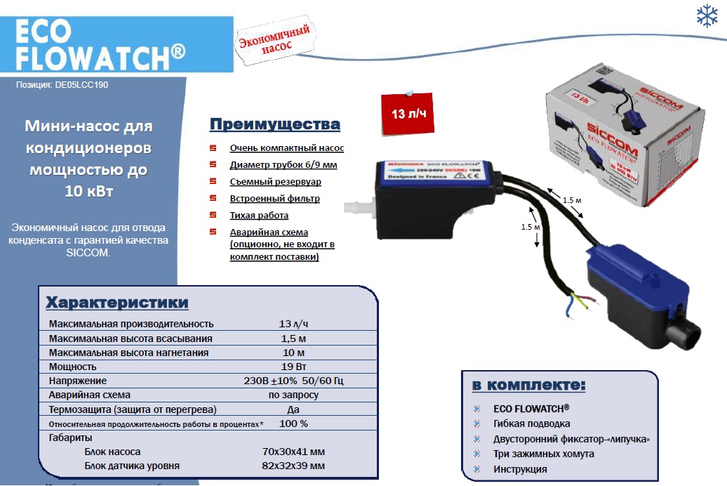Производительность встраиваемых помп варьируется 5-170 л/час. Их мощности достаточно для обеспечения нормального функционирования сплит-системы.