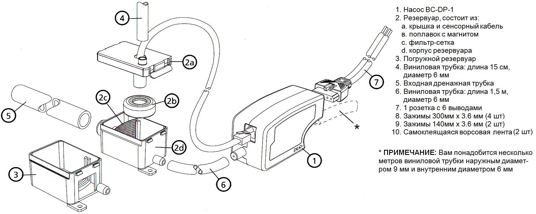 Резервуар может устанавливаться внутри поддона климат-системы, на отводной трубе или шланге. Модуль управления, насос объединены как отдельная конструкция, которая соединяется с резервуаром шлангом подачи воды и проводом датчика.