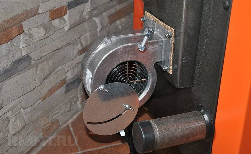 3. Форма организации поддува. Путём уменьшения поступающего кислорода можно сильно растянуть длительность горения, поддерживая температуру воды в заданных пределах. Обычно реализуется за счёт ручной или управляемой заслонки, при недостаточно сильной тяге может использоваться вентилятор наддува. Управление заслонкой, как правило, выполняется цифровой автоматикой, контролирующей температуру воды в патрубке подачи.