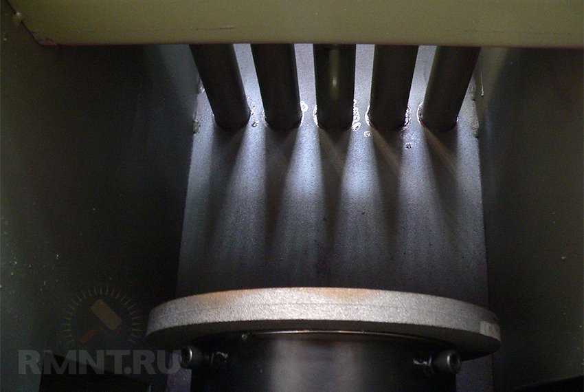 Конструкция представляет собой вертикально расположенный цилиндр со штоком и прижимным диском, обеспечивающим равномерное распределение воздуха по всей поверхности горения.