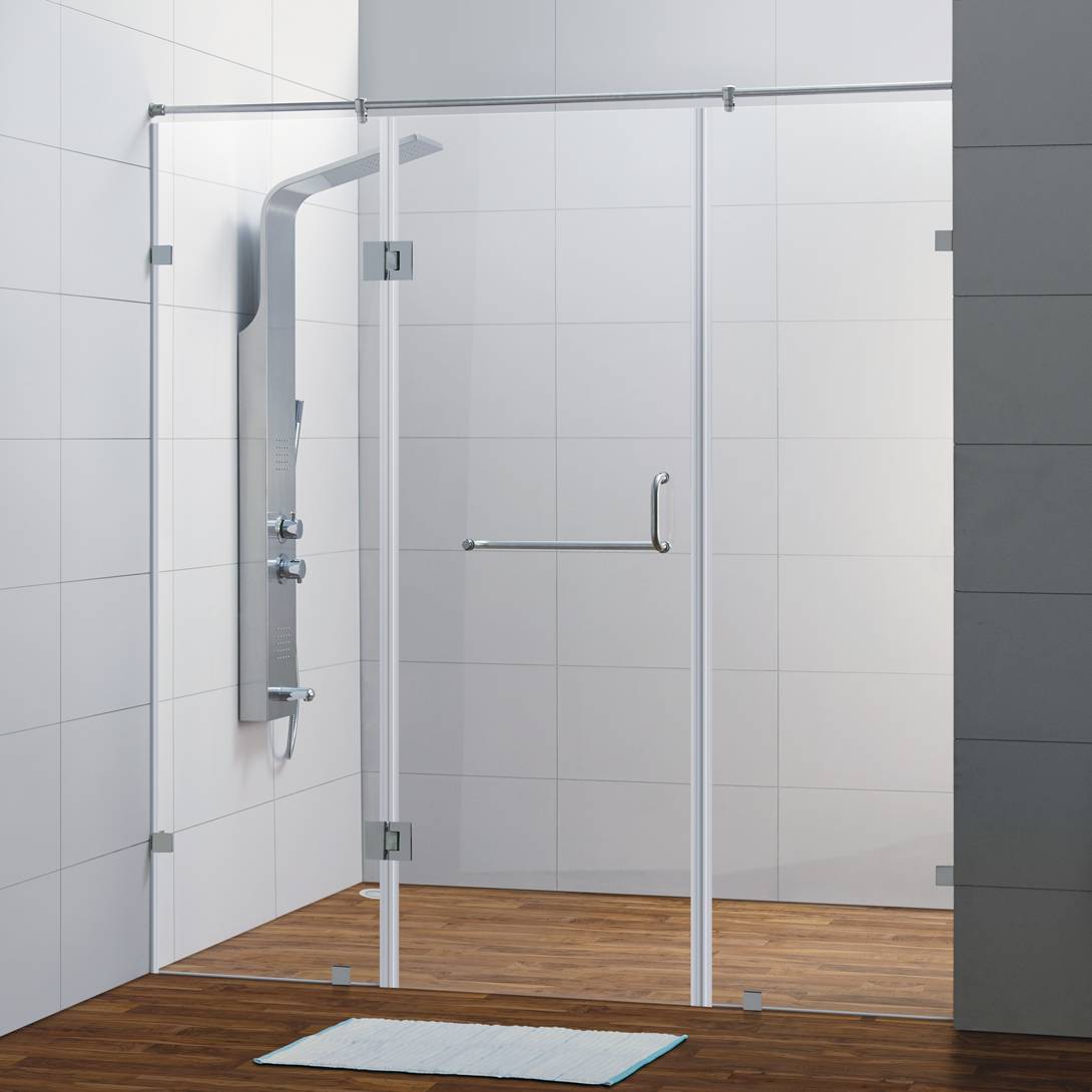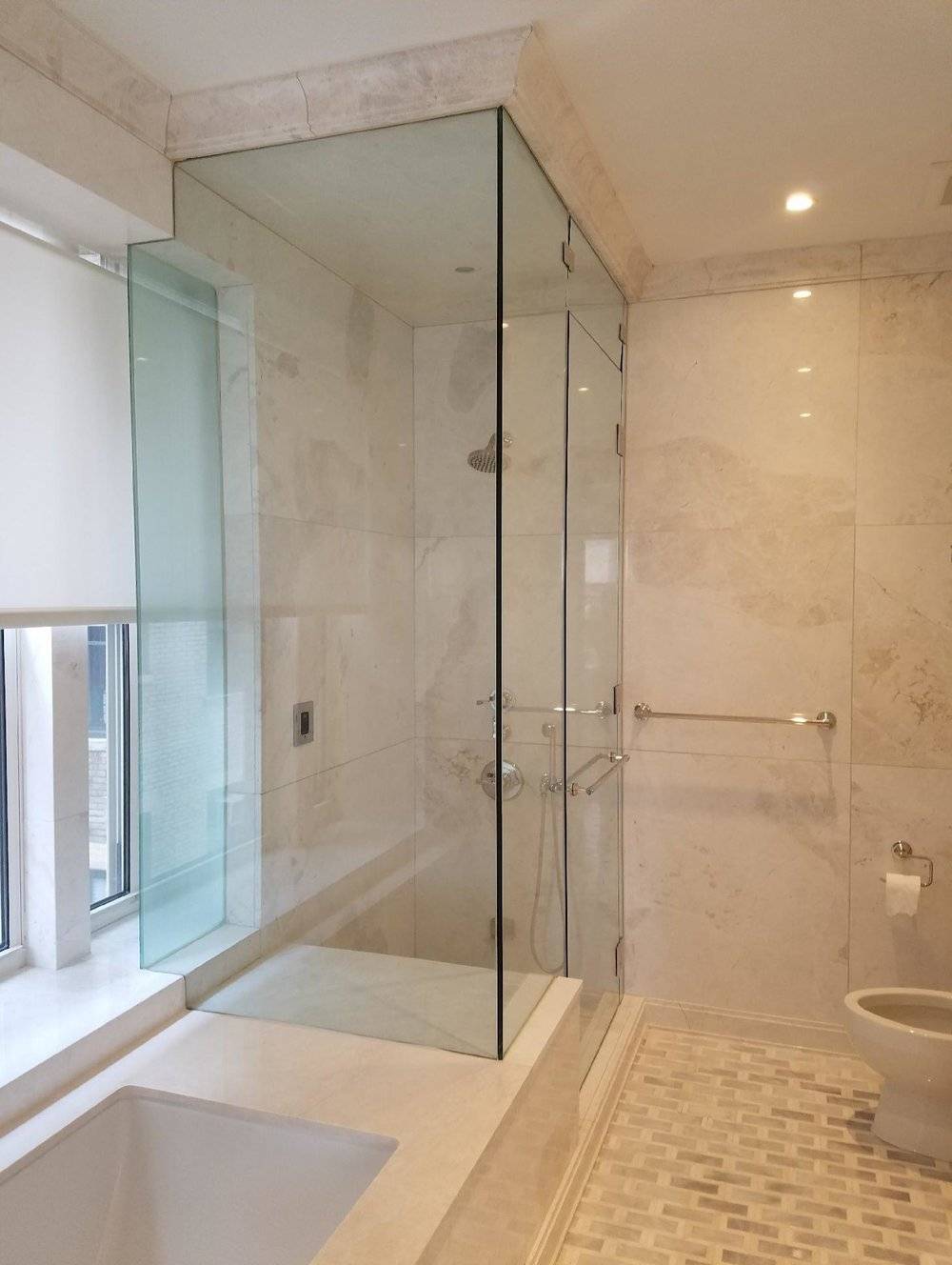 Перегородки для установки в душ из поликарбоната возводят на каркасе из алюминия или усиленного пластика. Но есть варианты, где панели не обрамляют металлопрофилем, а крепят к стенам и между собой особыми фитингами и коннекторами.