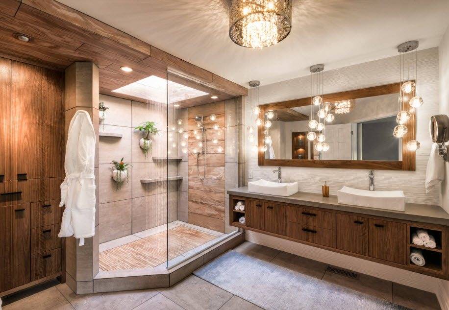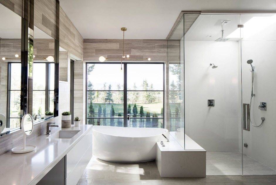 Владельцы просторных ванных комнат при выборе душевых кабин располагают гораздо большей свободой — об экономии площади и типах дверец задумываться не приходится. Это позволяет полностью сосредоточиться на дизайне модели.