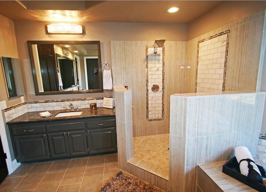 Душевую можно организовать разными способами, но не все имеют смысл. Критерий — соотношения дизайн/цена. Стильный дизайн ванной комнаты возможен только с душевой без кабины.