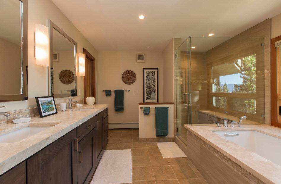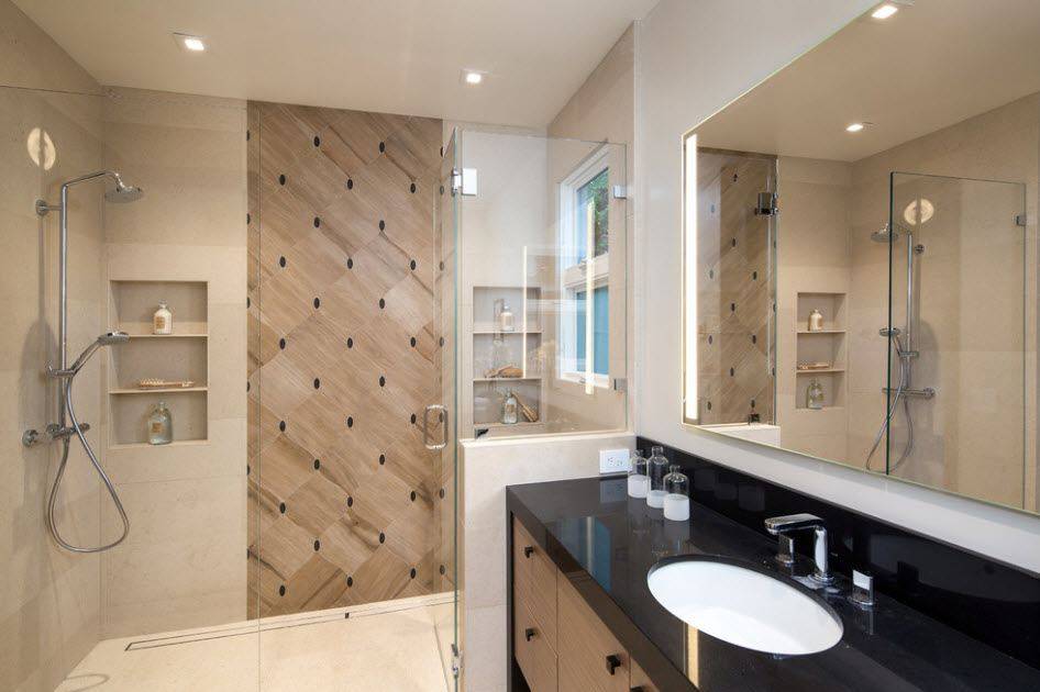 Интересная облицовка ванны с душевой кабинкой светлым кафелем и темным декором. Пол выполнен в хаотичном порядке с помощью квадратной плитки в близких оттенках. Комната разделена на две зоны с помощью платформы. Душевой поддон выложен из пиксельной плитки бежевого цвета. Можно использовать и мозаику. Лейка и смеситель, а также умывальник выделены с помощью индивидуальной облицовки коричневыми панелями под дерево.