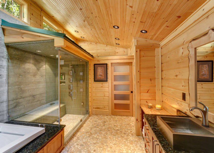 В ванной комнате с гидробоксом есть возможность использовать в качестве оформления или аксессуаров элементы из натурального дерева, обои и фрески, лишняя влажность такой комнате не страшна, даже если в плане или проекте нет окна. В гидробоксах есть много функций: это и массажный кабинет и СПА салон.