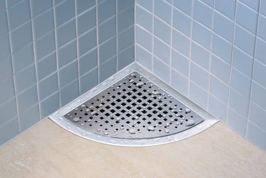 - В углу. При таком расположении устанавливают трап треугольной формы.