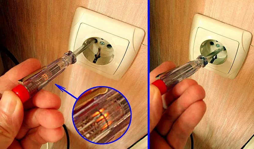 При нормальном режиме работы розетки проверяя наличие напряжения картина должна выглядеть следующим образом. При прикосновении к фазному проводу, должно появляться световое оповещение, а при прикосновении к нулевому, лампочка индикатора светиться не должна.