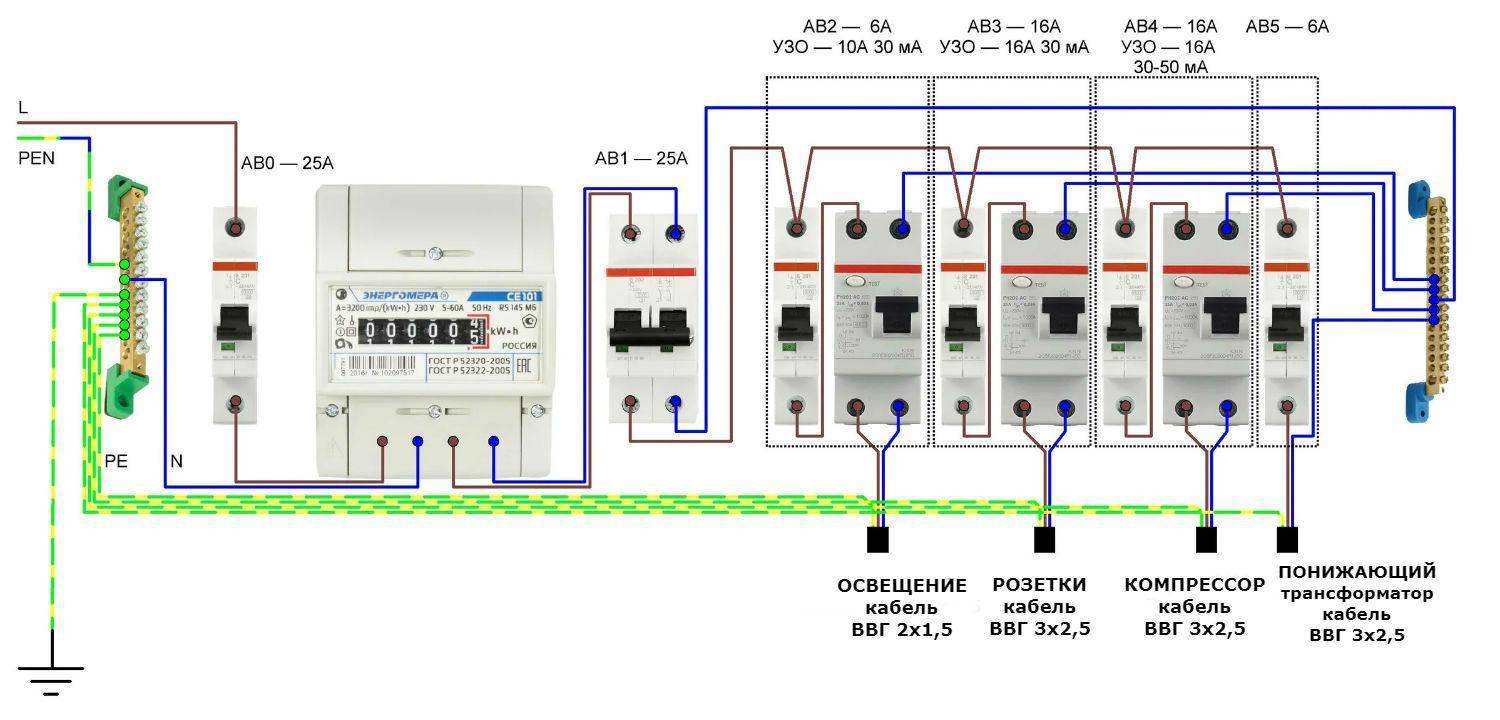 Для проводки в частном гараже по схеме с напряжением в 220 вольт потребуется: