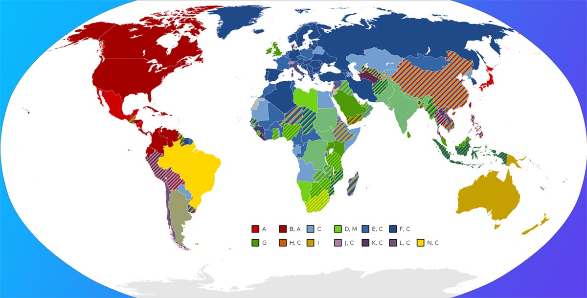 При переходе на стандарты 110/220 В многие согласились с решением использовать вилки типов A и B при американском и вилки типов C и M при европейском типе электросетей. Но сделали так далеко не во всех странах мира.