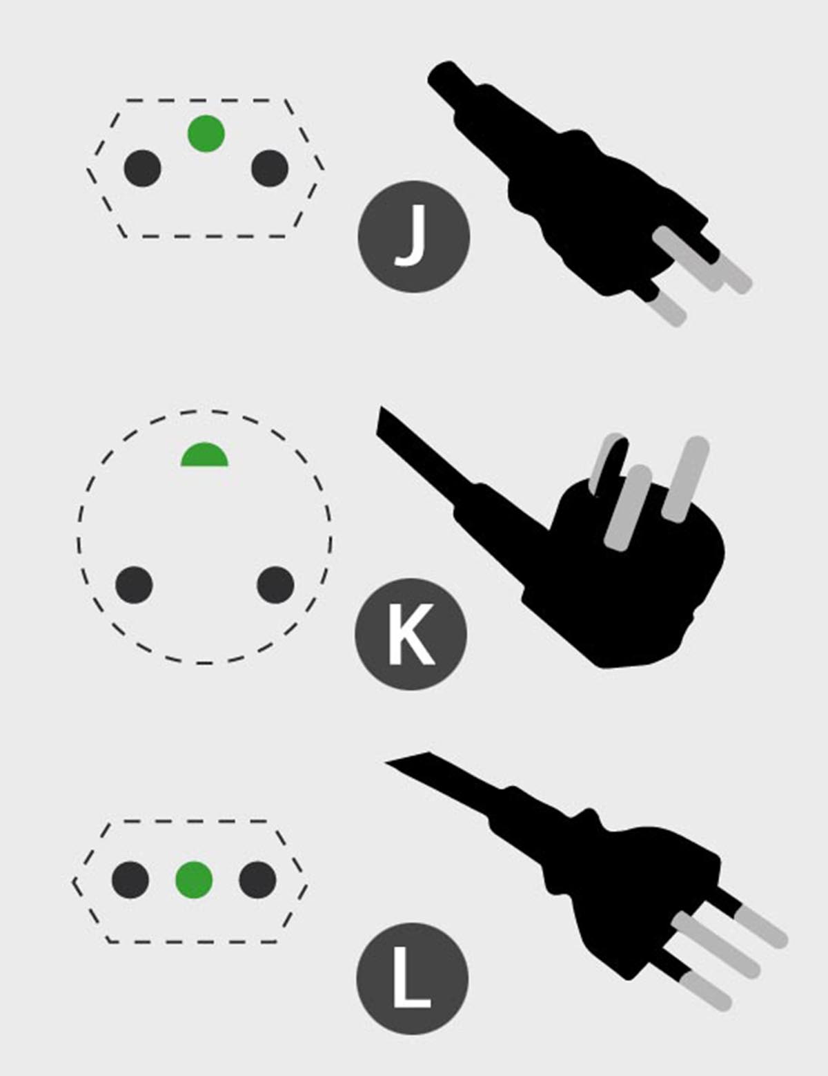 Тип J стандарт для Швейцарии, который похож на европейский тип C. Он отличается смещенным третьим контактом заземления, а розетка более мелкой глубиной посадки вилки. Европейские вилки без проблем работают в сетях Швейцарии, но не наоборот.