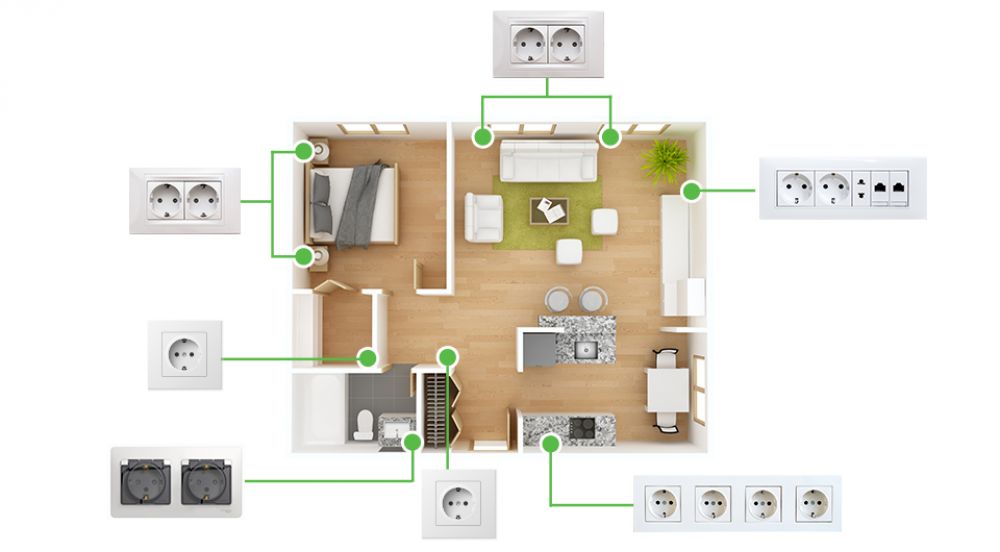 В соответствии со своим дизайн проектом розетки размещаются как можно ближе к бытовым приборам, чтобы минимизировать количество видимых проводов. Так же чтобы не ошибиться в количестве устанавливаемых розеток воспользуйтесь правилом – 1 розетка на 6 кв.м.