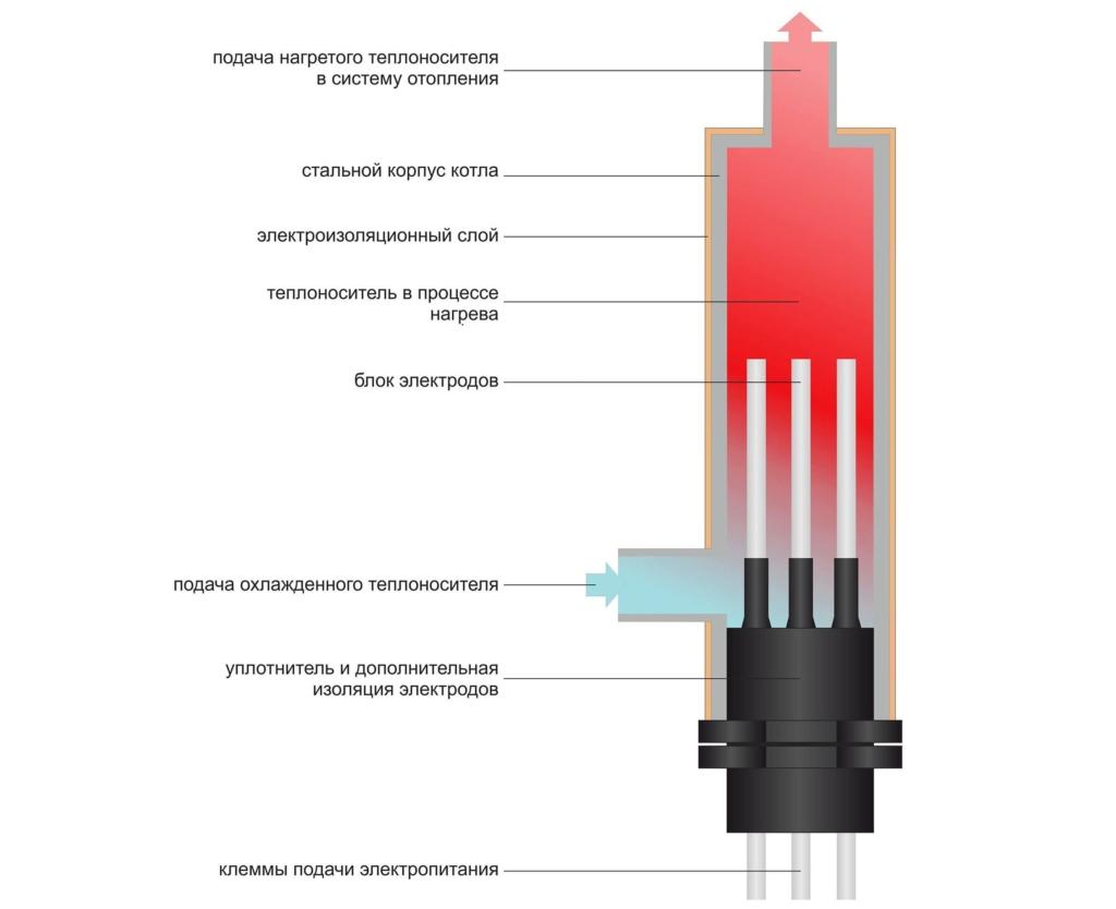 В электродных котлах нагревательным элементом служит теплоноситель. Благодаря проводимости тока между электродами, находящимися в жидкости, возникает движение заряженных частиц. В результате этого эффекта и происходит повышение температуры воды. Ионные котлыне занимают много места, быстрее нагревают жидкость.