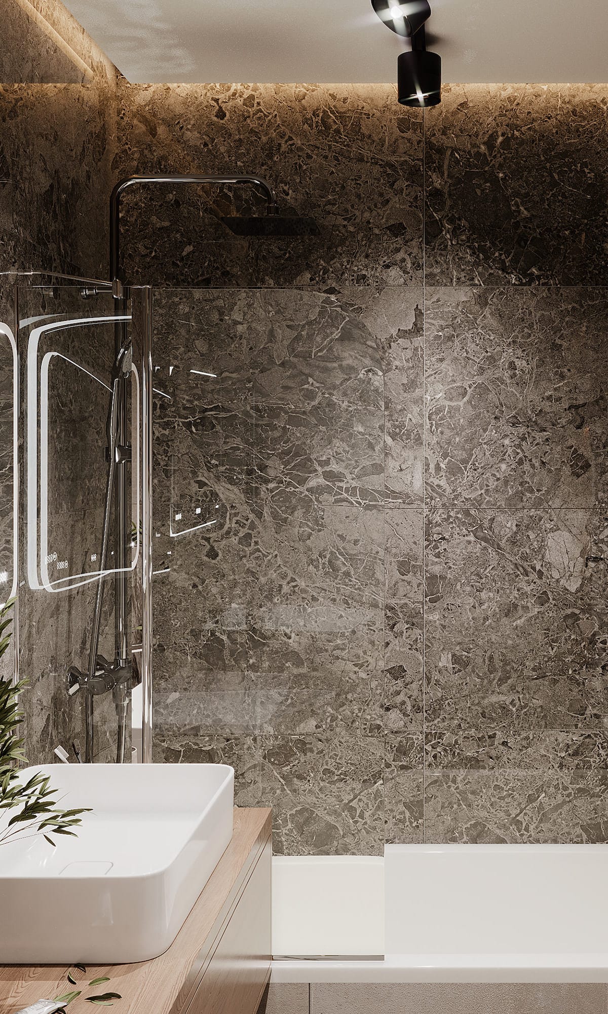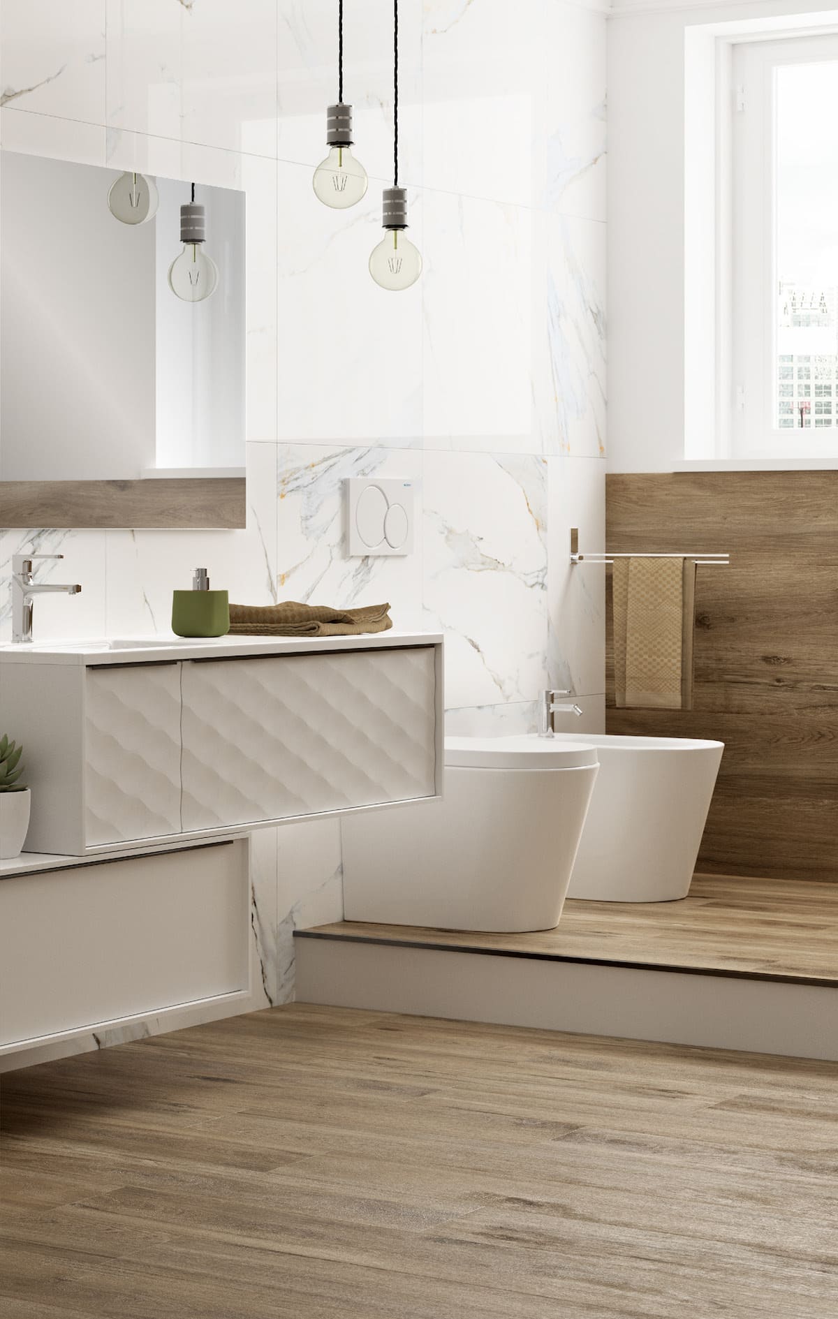 Очень популярной альтернативой дереву и мрамору является плитка для ванной, имитирующая эти материалы — это более дешевое и удобное решение, поскольку не требует специальной пропитки и ухода.