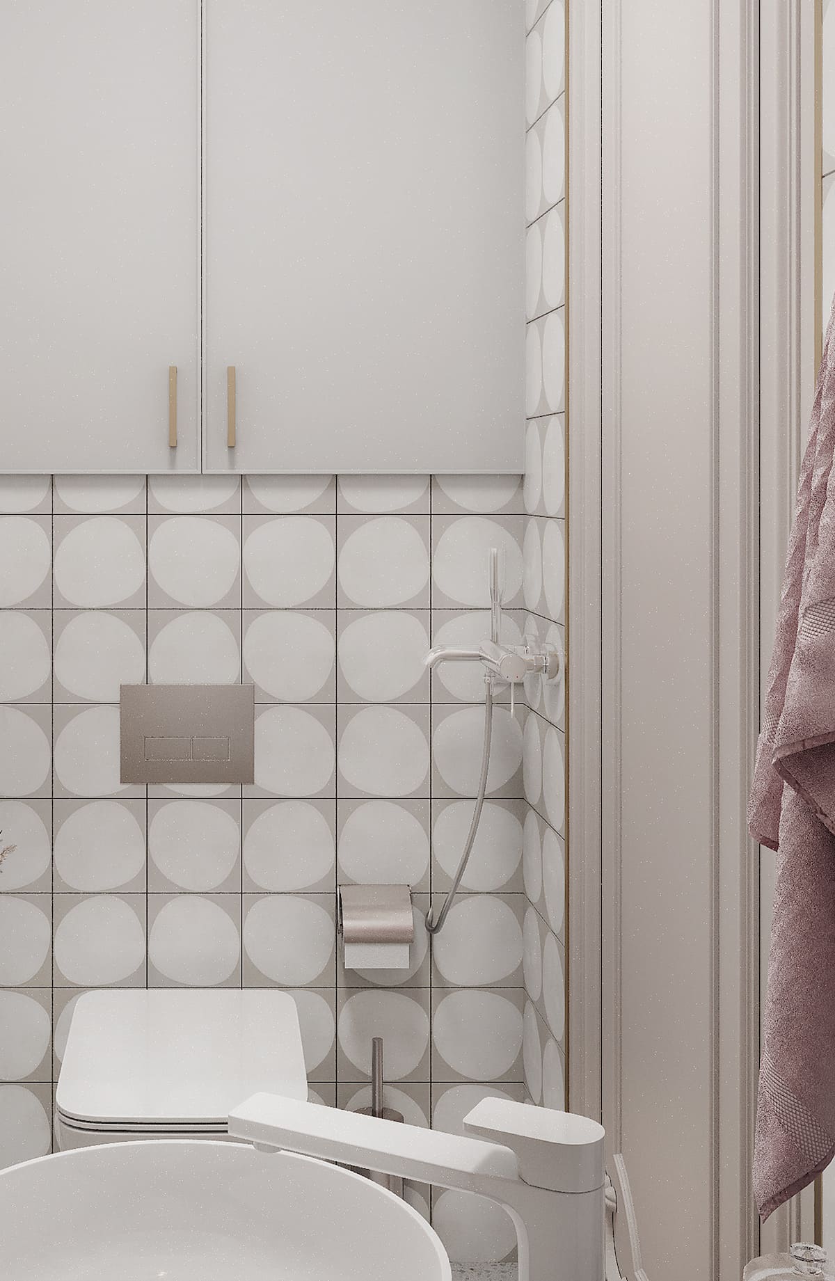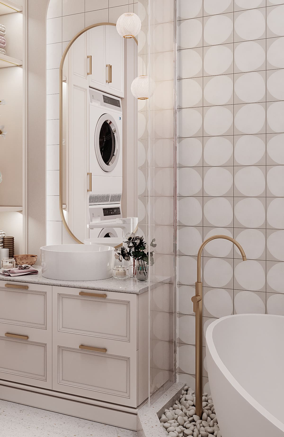Смело можешь сочетать несколько оттенков в пределах теплой или холодной гаммы – это даст мягкое разнообразие. Используй необычные материалы: мрамор, мозаику, гальку, выбеленное дерево, фактурные коврики.