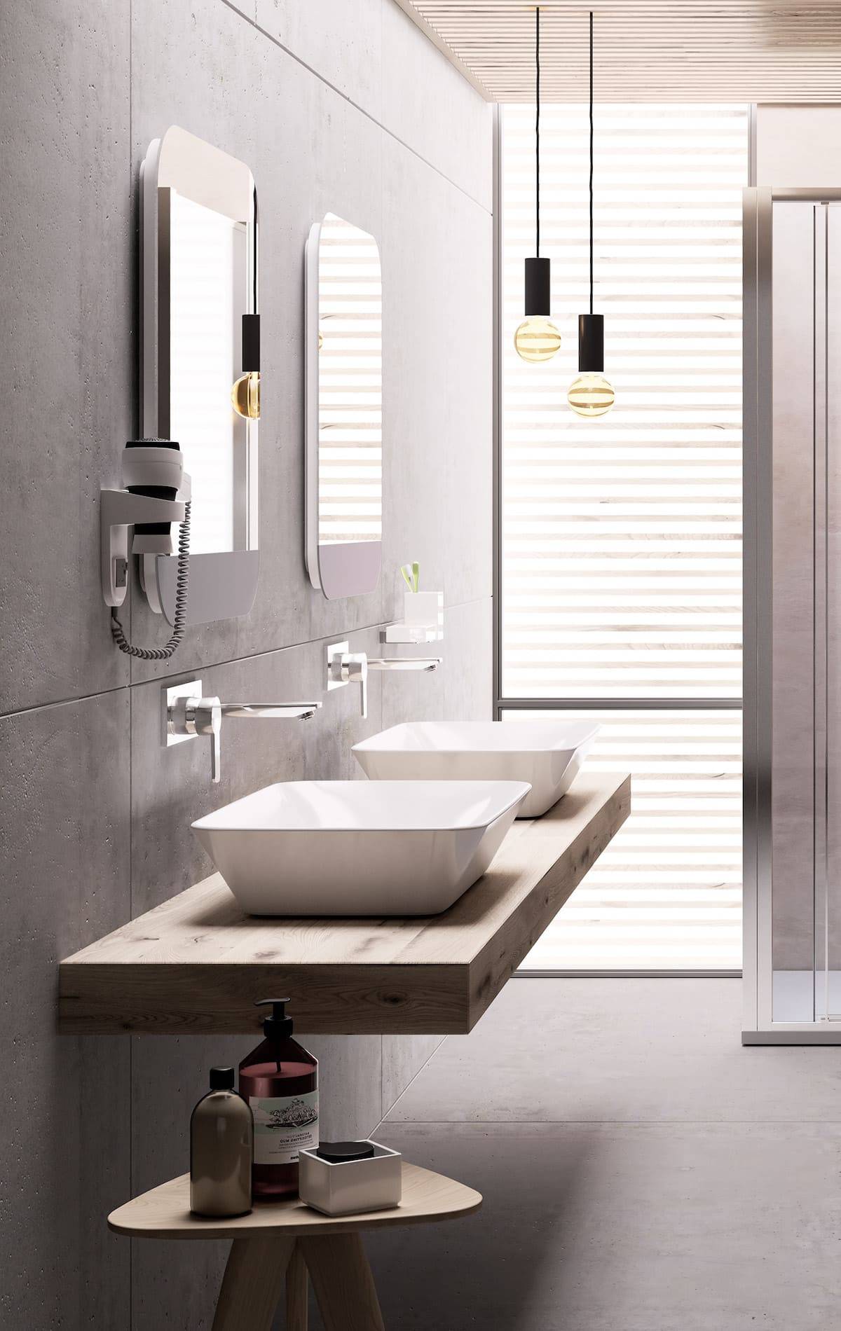 Обязательными являются светильники в рабочей зоне возле зеркала. Даже если у вас есть окно и естественного света хватает, не забывайте, что в зимнее время освещения становится меньше. Размещение светильников планируется в самом начале ремонта.