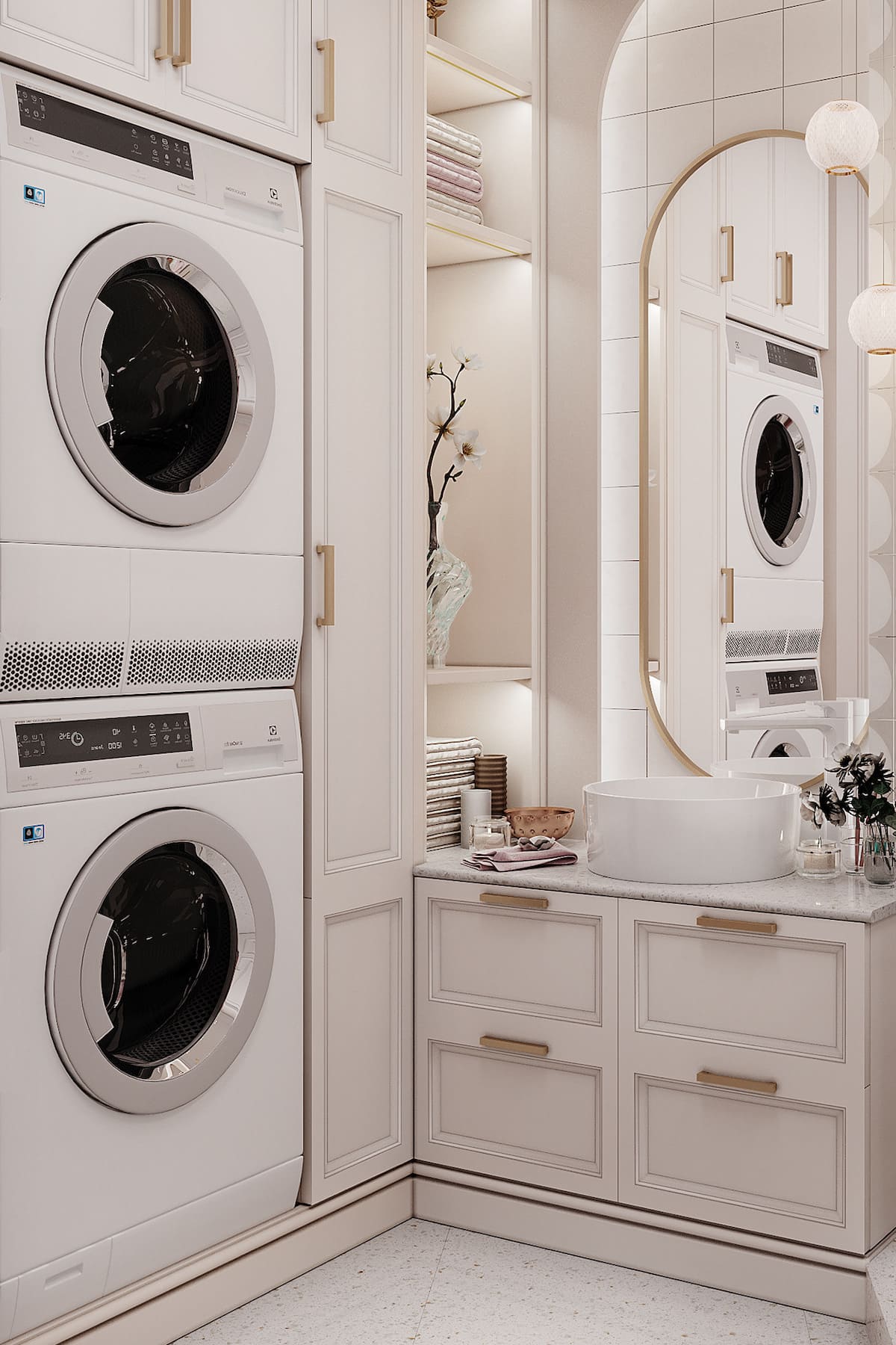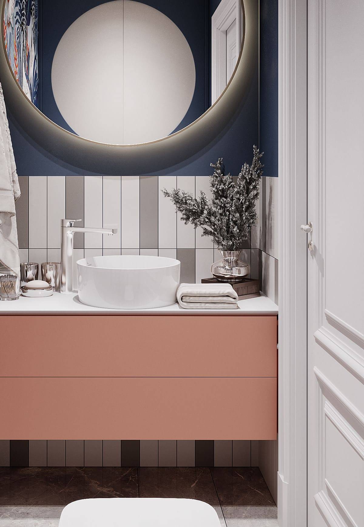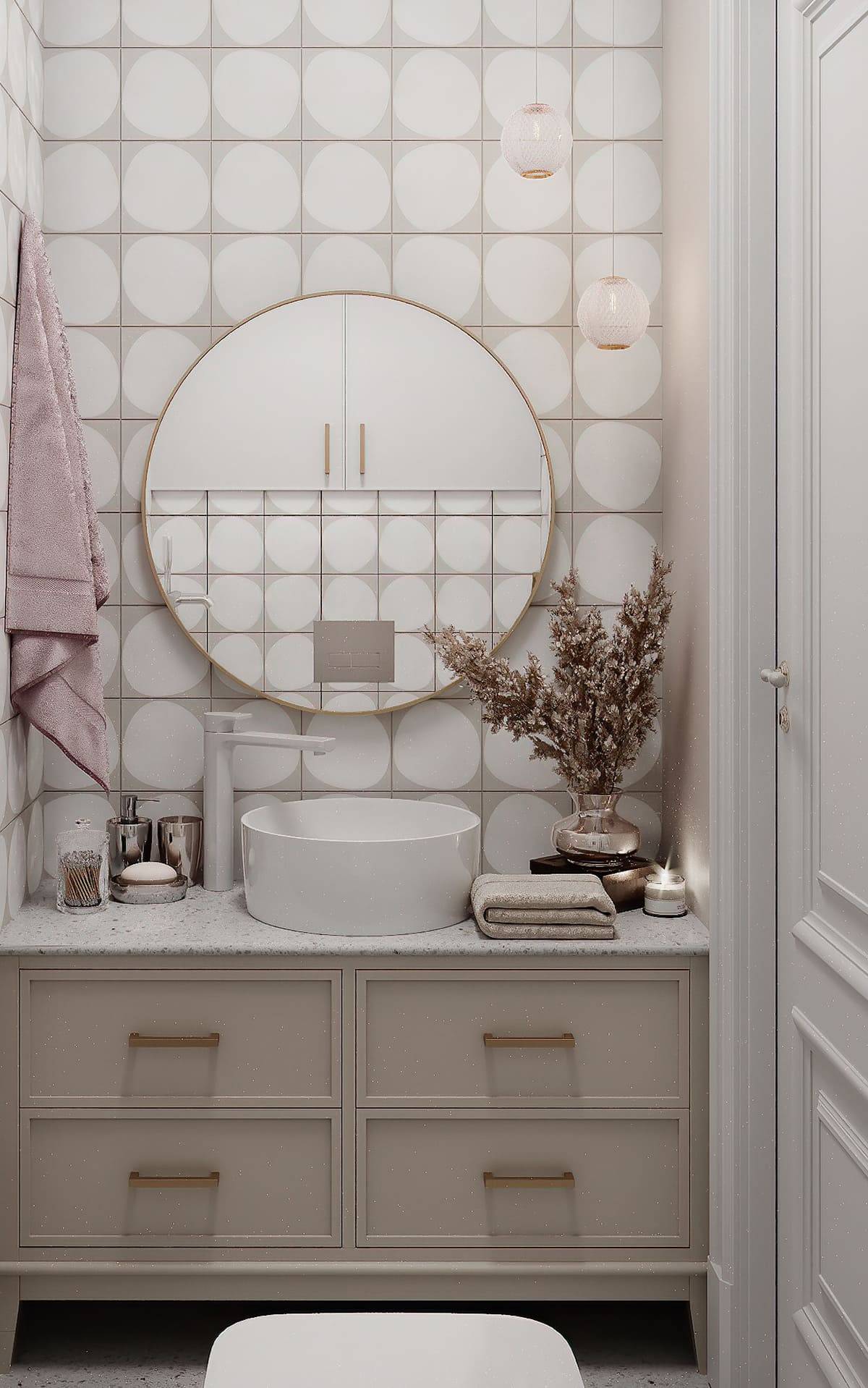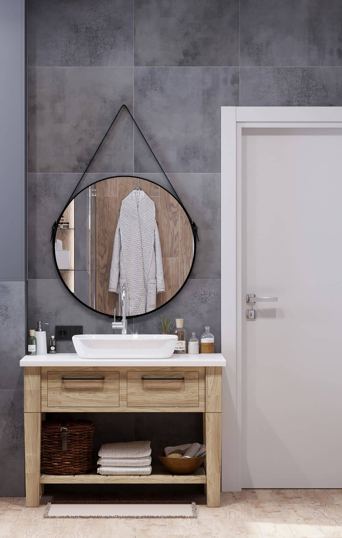 Сочетайте его с деревянными аксессуарами и хромированными или черными кранами. Для раковины используйте деревянный или полированный бетонный шкаф, а если вы хотите более традиционный вид, добавьте корзины для хранения полотенец или туалетной бумаги.