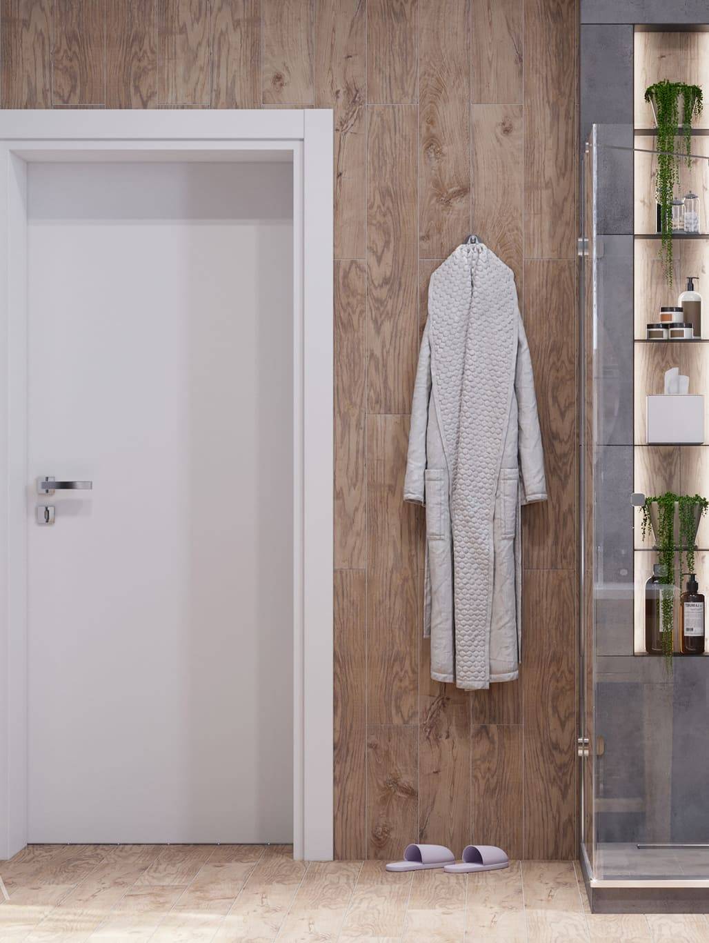 Распространенным решением является небольшая современная ванная комната из дерева, которая обычно относится к скандинавскому стилю и обычно более уютна, чем ванная, отделанная только камнем.