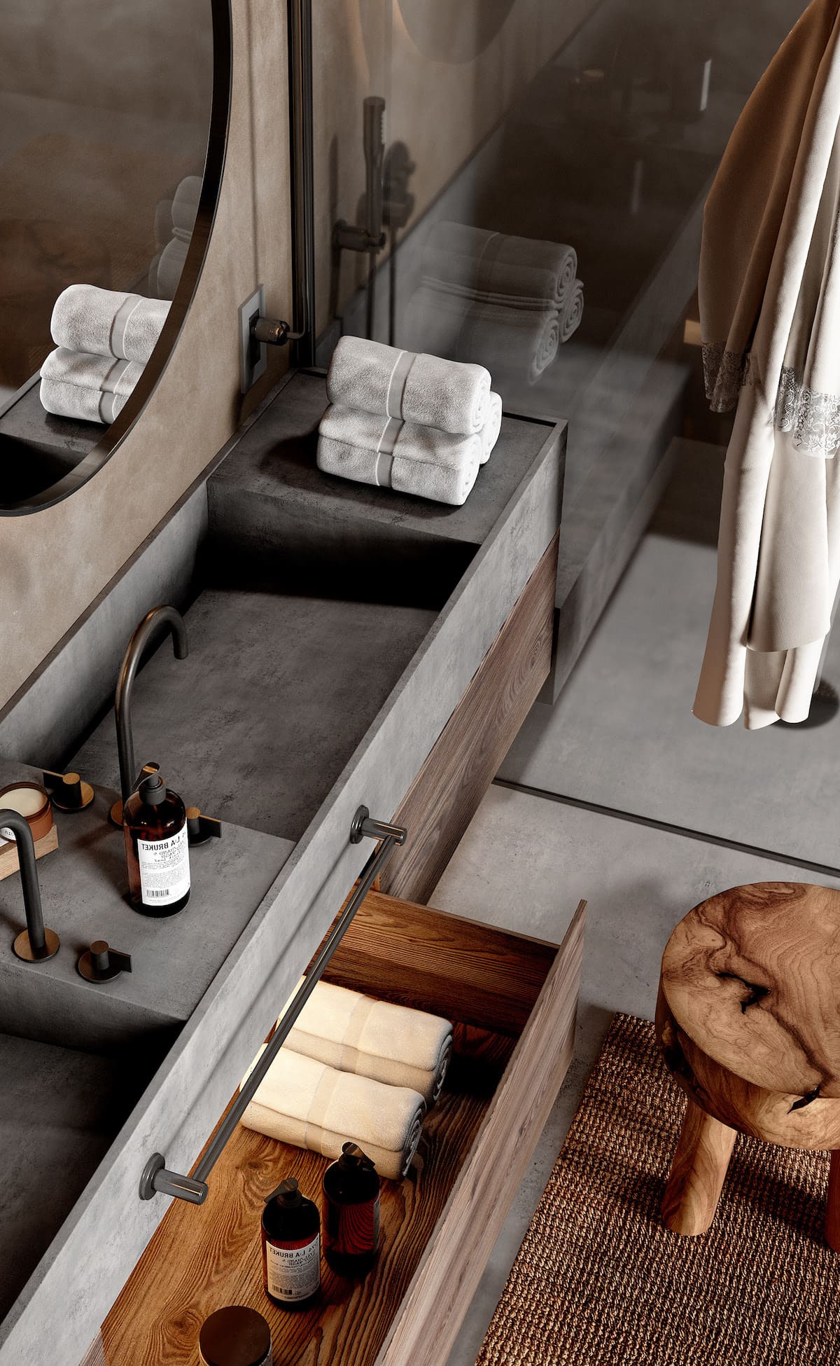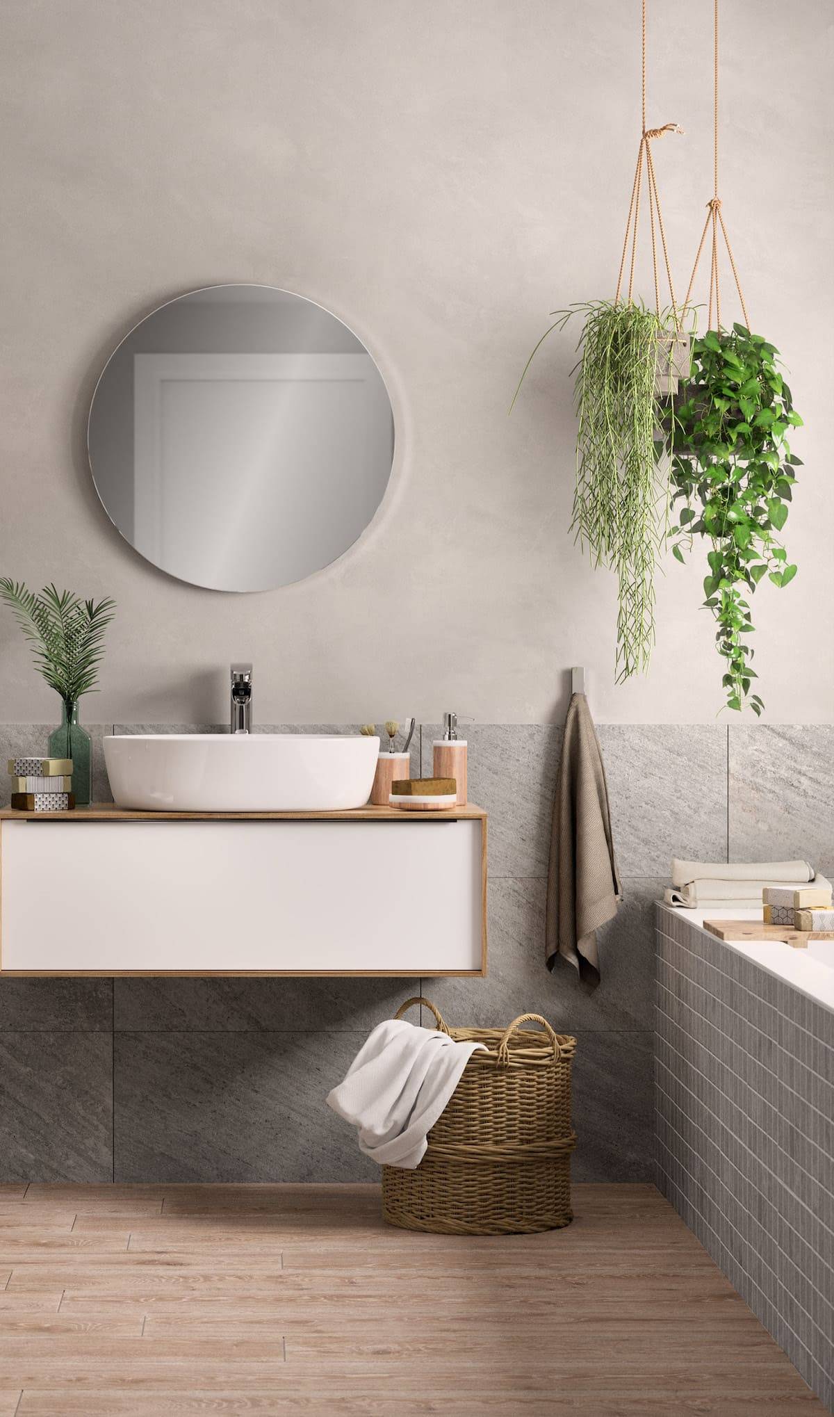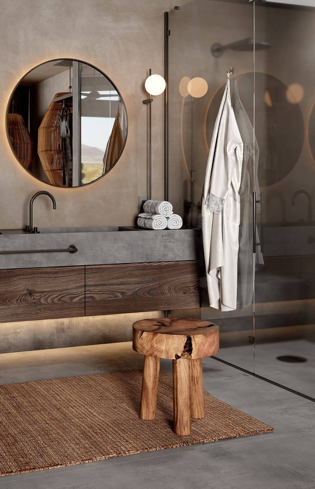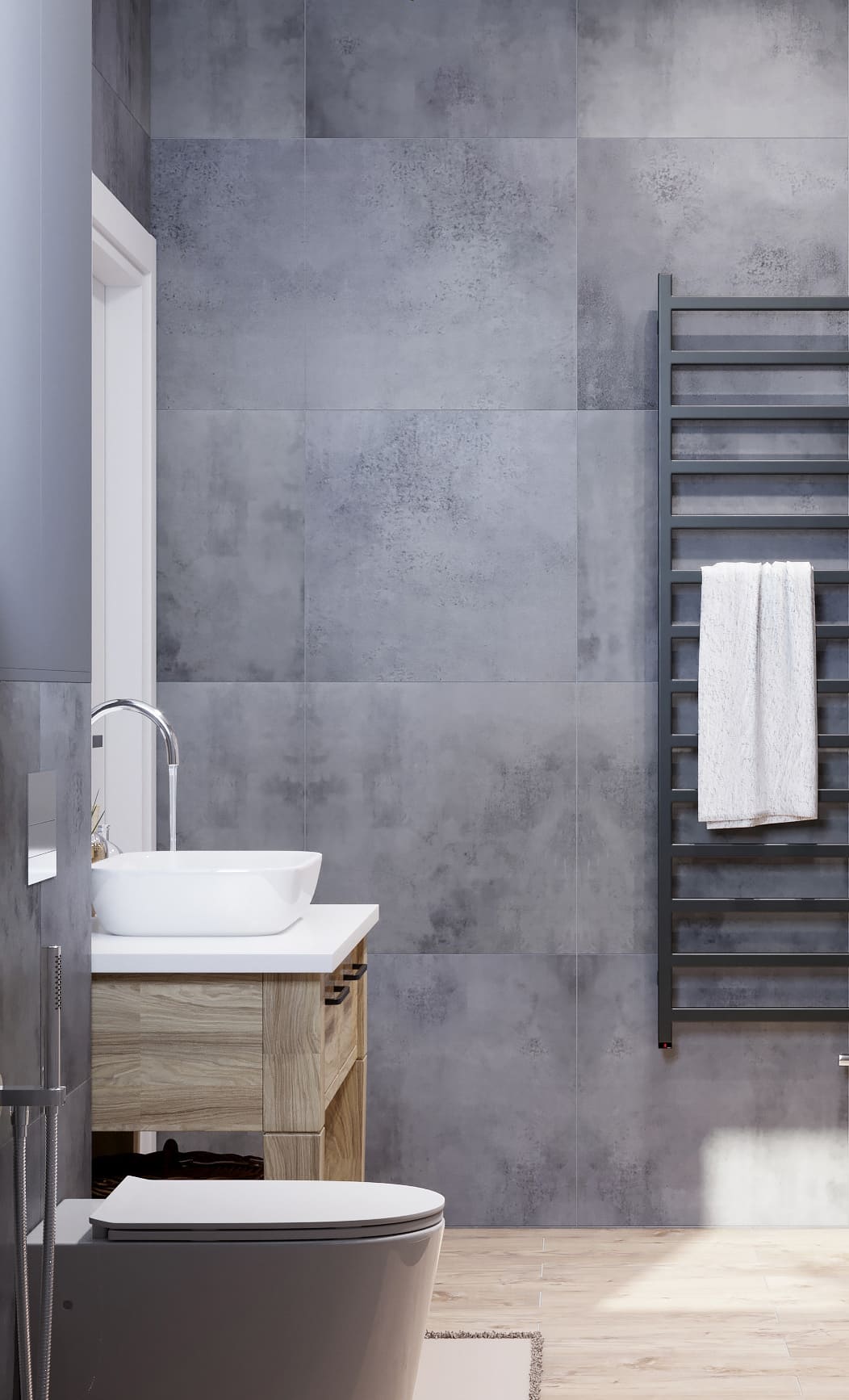 Среди всех этих материалов у нас также есть цемент, и покрытие, имитирующее цемент, идеально подходит для вашей ванной комнаты. Это дает вам расслабляющий и спокойный стиль.