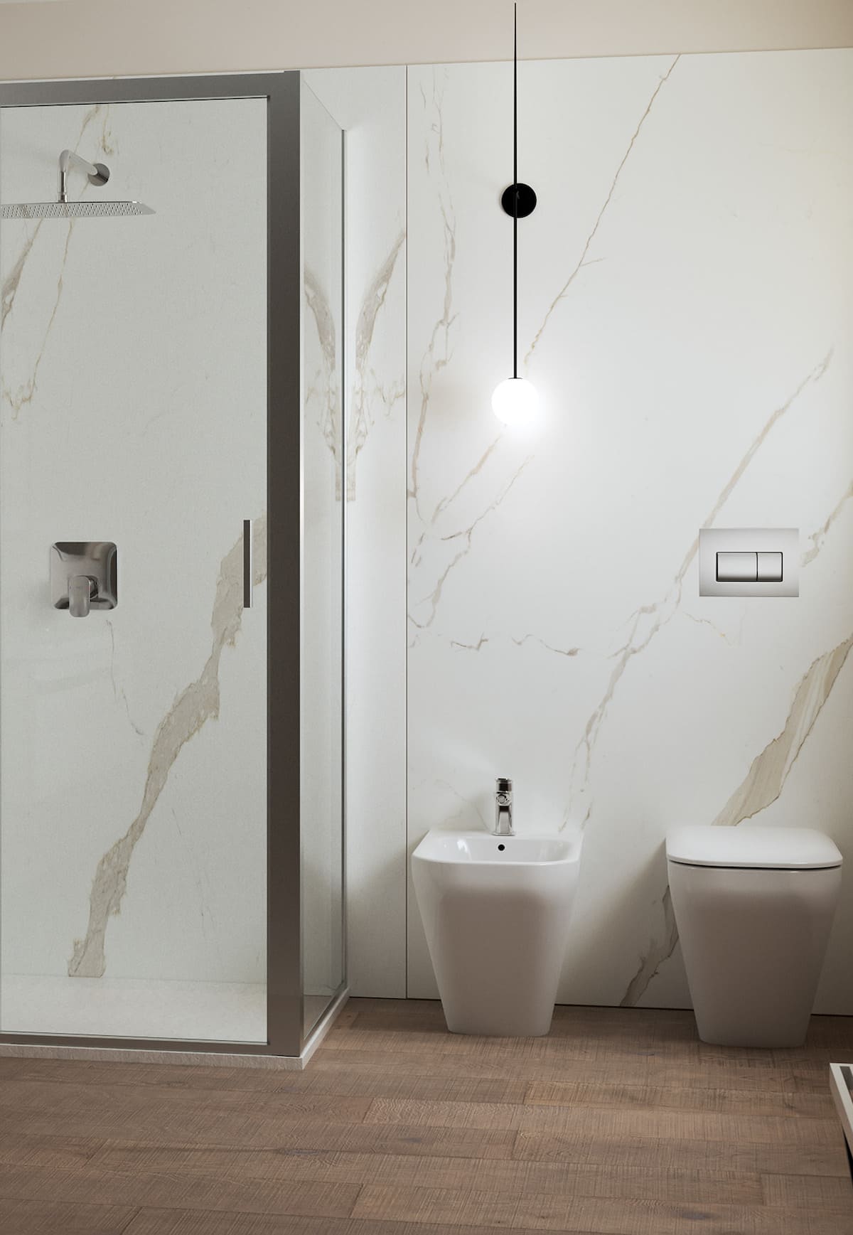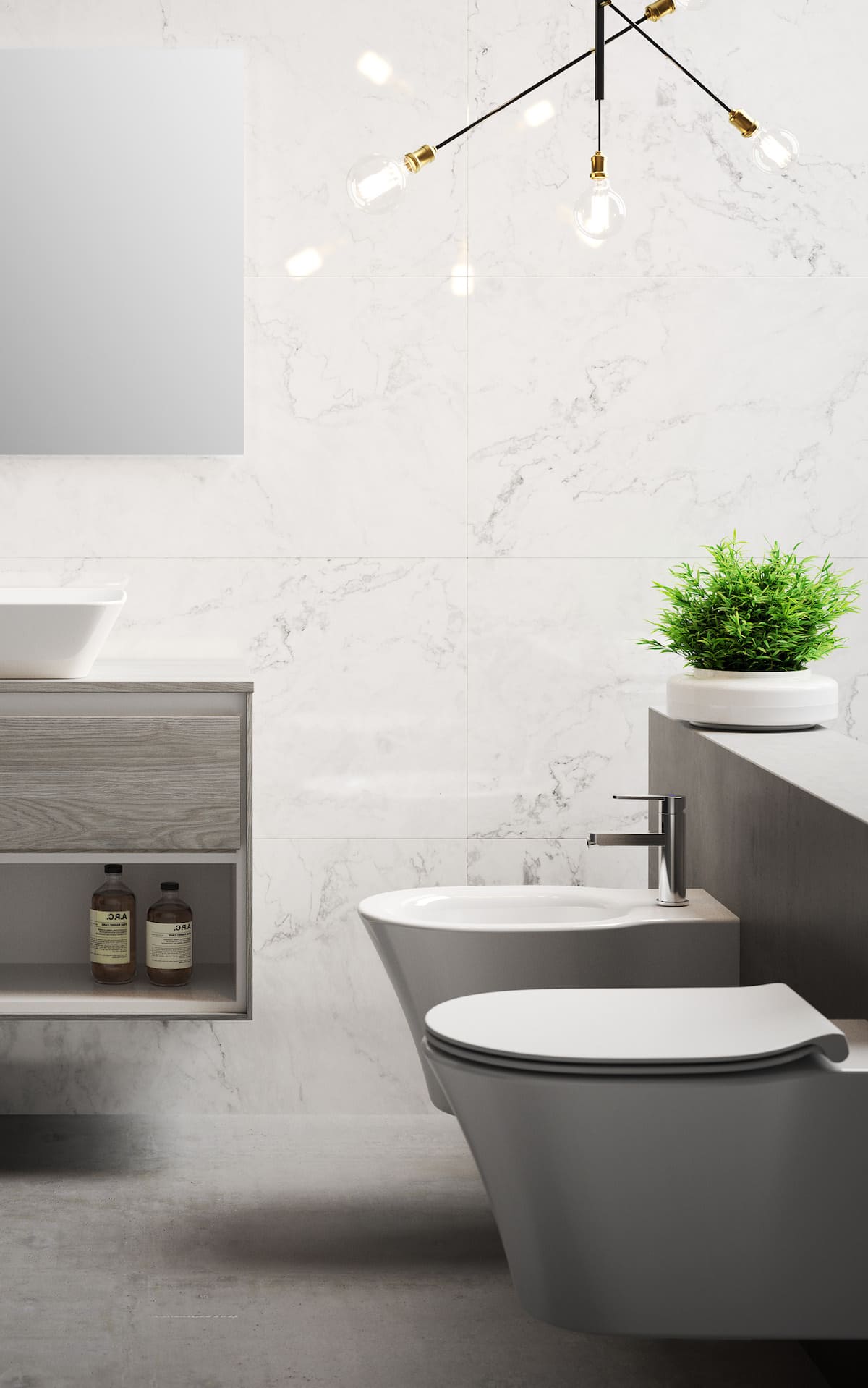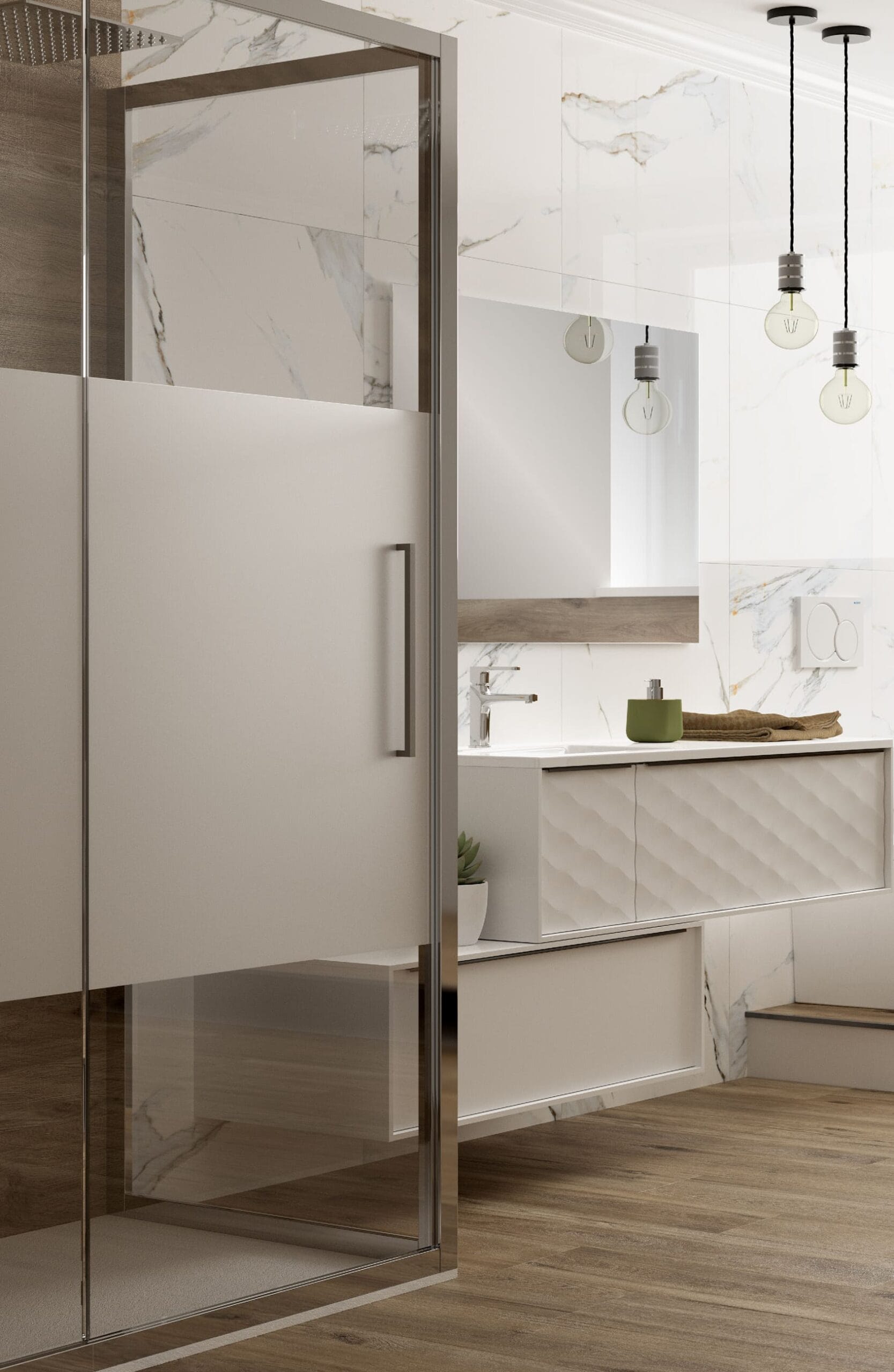 Вы можете создать очень элегантную ванную комнату с плиткой под мрамор. Как на стенах, так и на полу или столешнице, он придаст вам тот оттенок роскоши, который вам нужен в вашей ванной комнате. Вы также можете выбрать между матовой или глянцевой полированной поверхностью.