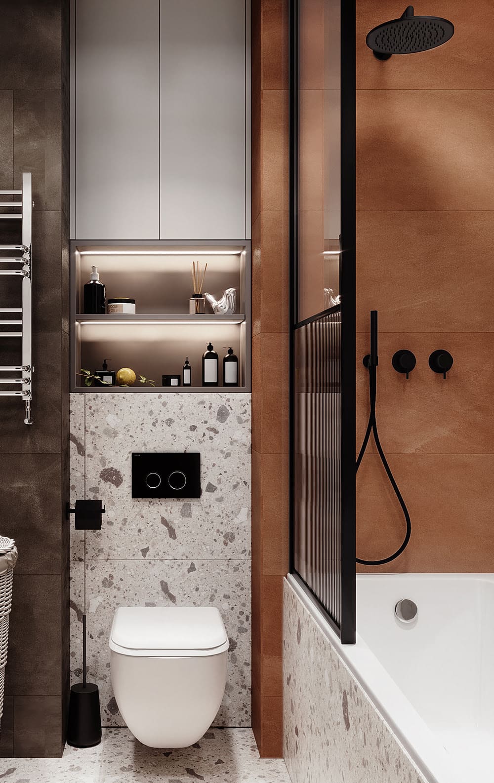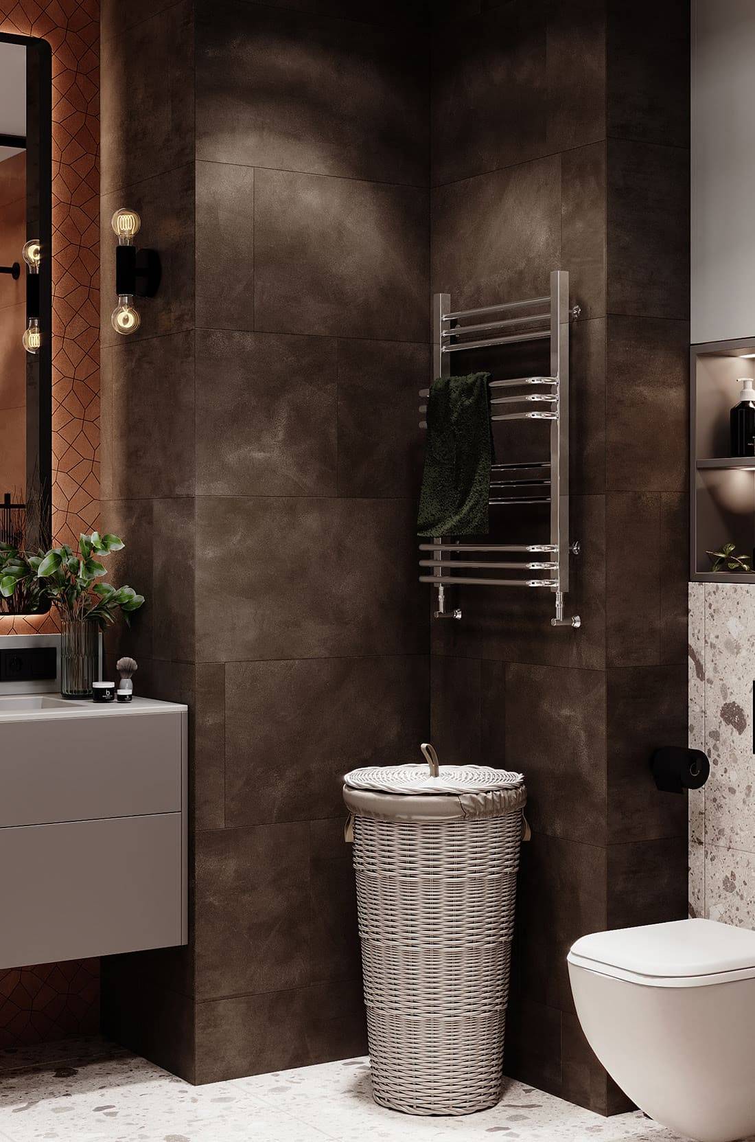 Можно поэкспериментировать и с коричневым цветом. А вот терракота, оливковый, пыльный и ржавчина уже выходят из моды. Но их можно использовать при оформлении держателей для полотенца и подставок для мыла.