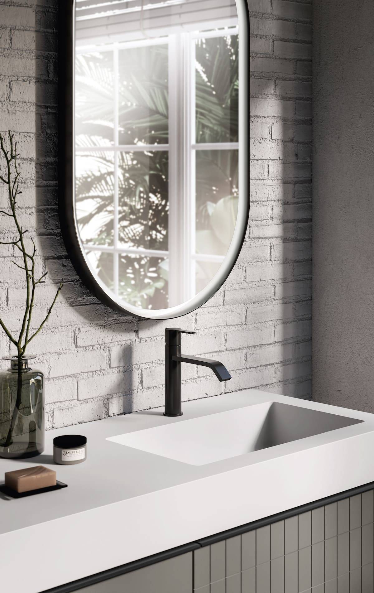 Очень популярна однотонная квадратная плитка, которая отлично смотрится в тандеме с контрастной затиркой. Это вневременный выбор. Простая и симметричная форма — ее главное достоинство. Стоит покрыть подобным отделочным материалом не только стены, но и столешницы в ванной, чтобы придать эстетической выразительности интерьеру.