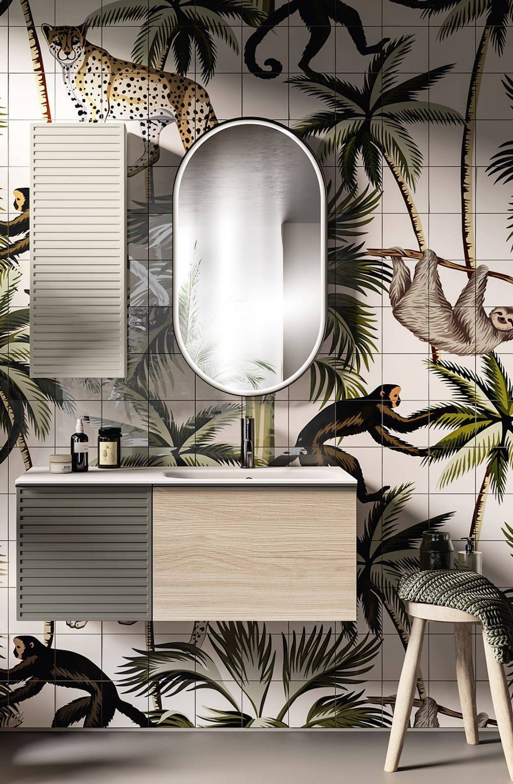 Примечательно, что вовсе не обязательно использовать натуральный его вариант – достаточно будет и качественной его имитации, чтобы визуально освежить ванную комнату и привнести в атмосферу здоровые нотки гармонии и умиротворения. К примеру, использовать ее в мебели либо в виде керамической плитки на стене.