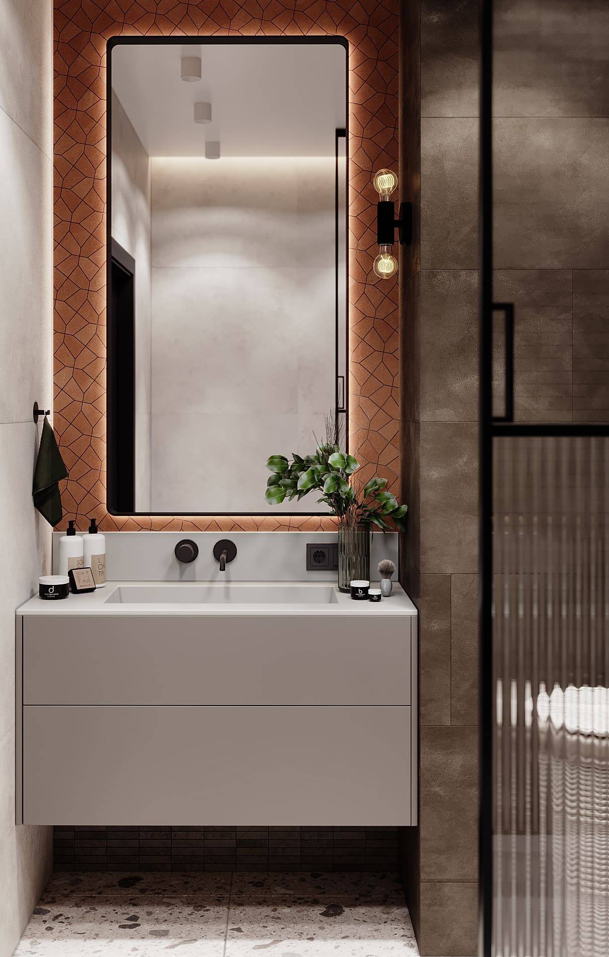 Черная сантехника очень стильная и модная. В качестве акцентов используй зеркала и подсветки. Можешь подсветить не только зону у умывальника, но и ниши, мебель, полки.